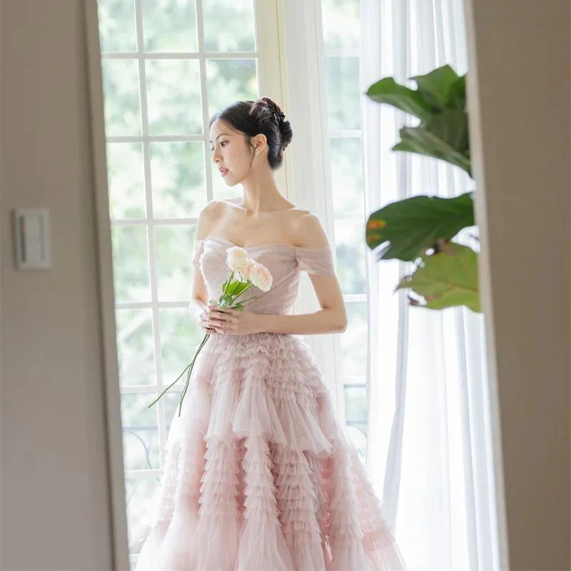 Détails : Superposition de volants, bustier à épaules dénudées, tulle rose poudré ample