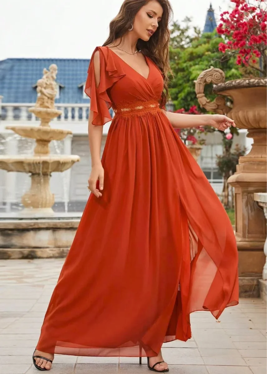 Cette robe est une ode à la liberté et à l’élégance. Sa jupe ample, agrémentée d’une fente latérale subtile, accompagne chacun de tes mouvements avec grâce, te garantissant une allure des plus avantageuses. Les manches courtes fendues et fluides apportent un volume aérien, parfaites pour pour un look à la fois bohème et sophistiqué. Que tu sois demoiselle d’honneur ou invitée, cette robe terracotta incarne le romantisme moderne, et sublime chaque instant de la cérémonie avec justesse.
