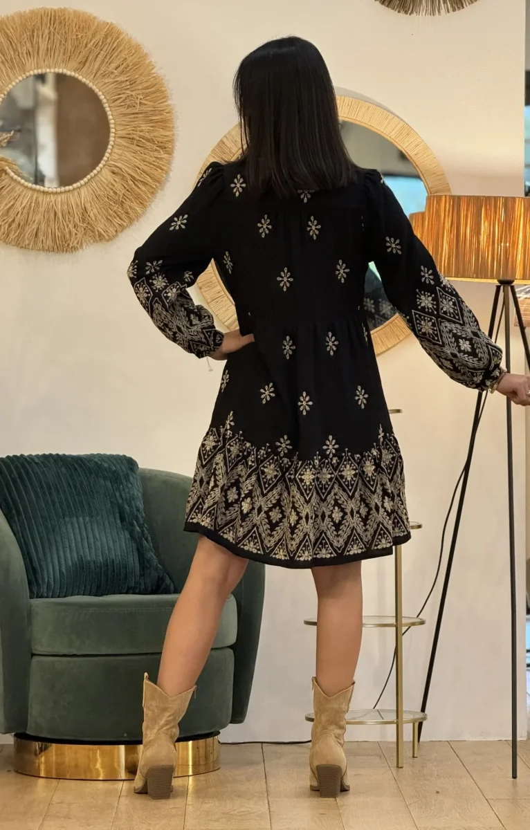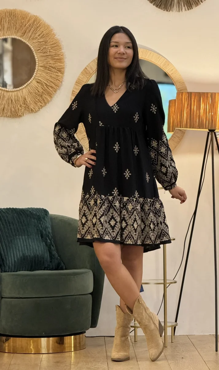 - Robe courte style babydoll col v – imprimé flocon de fleur