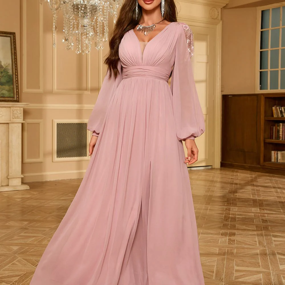 Laissez-vous séduire par cette robe longue rose poudré, au décolleté en V et aux manches longues bouffantes. Une tenue raffinée pensée pour sublimer chaque silhouette lors des grandes occasions.