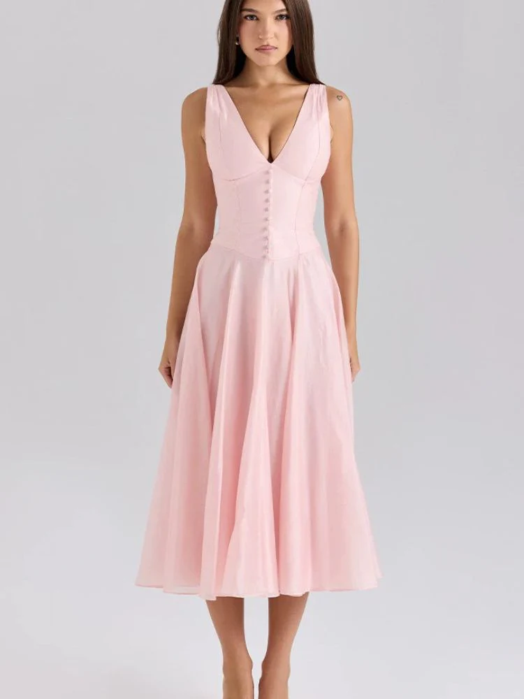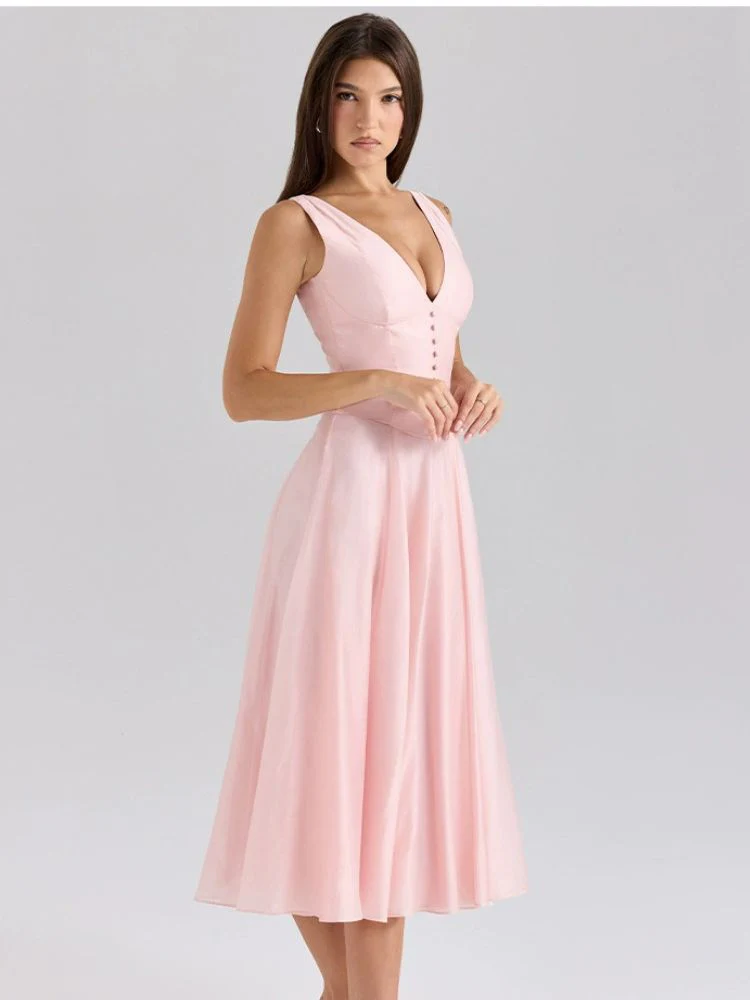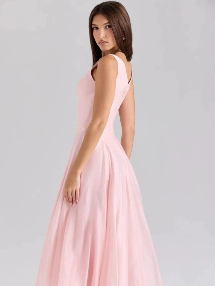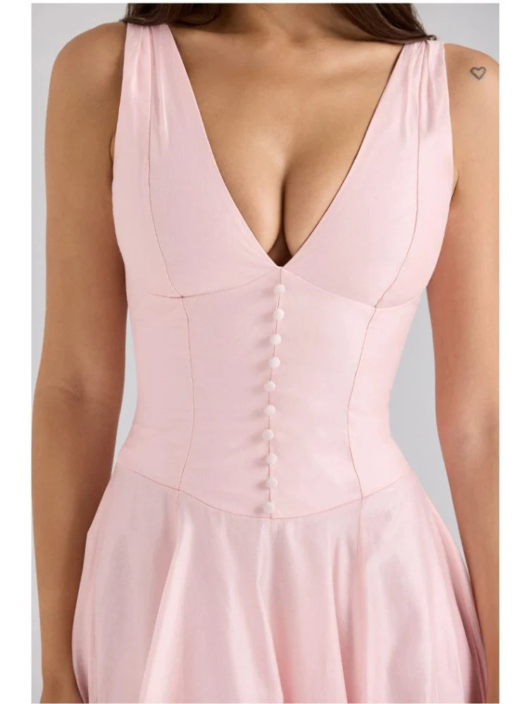 L’élégance incarnée : Robe rose poudré à décolleté plongeant