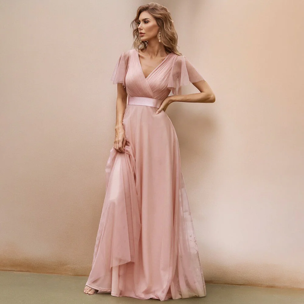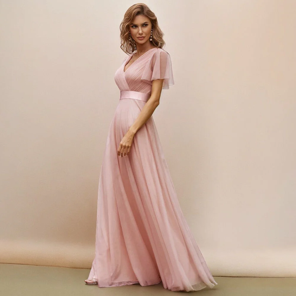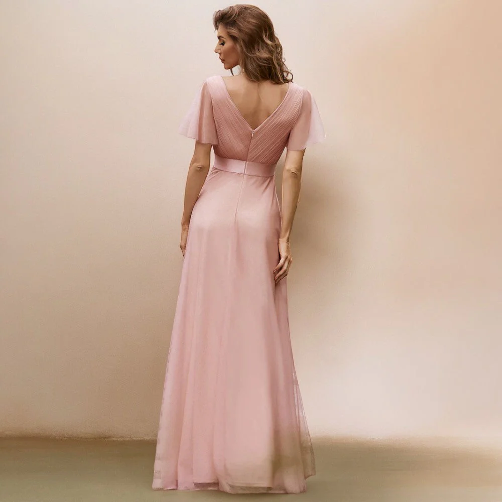 Cette robe longue rose poudré a été confectionnée spécialement pour celles qui désirent briller lors des grandes occasions. Son allure fluide et sa teinte délicate sont simplement parfaites pour un mariage.