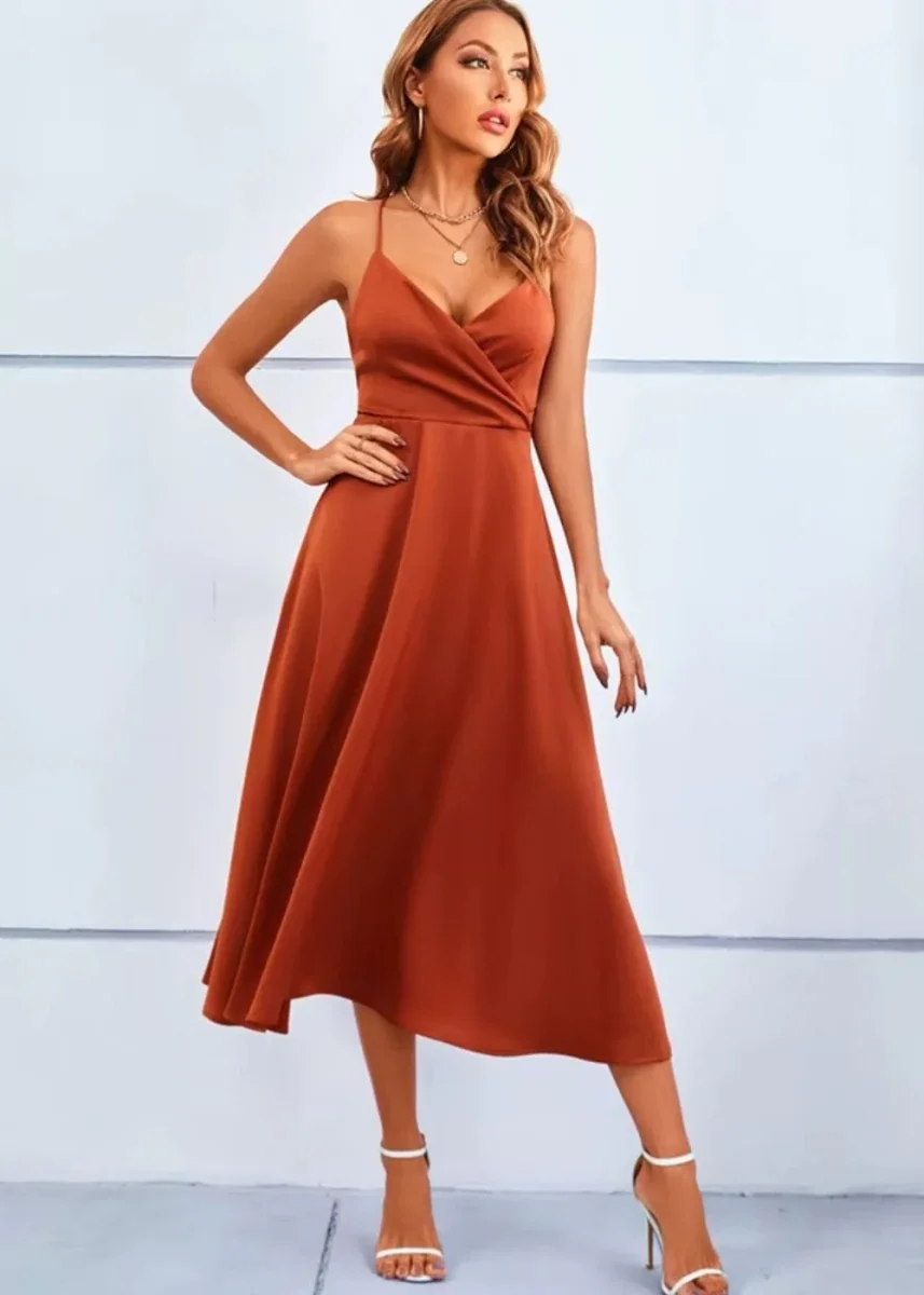 Tu cherches une tenue qui incarne la grâce et la modernité pour un mariage ? Craque pour cette somptueuse robe témoin de mariage terracotta, à la fois féminine et pleine de fraîcheur. Son tissu satiné fluide caresse la peau avec légèreté, tandis que sa coupe mi-longue évasée met en valeur ta silhouette en toute subtilité. Le décolleté cache-cœur apporte une touche sensuelle et élégante, parfait pour sublimer le buste avec finesse.