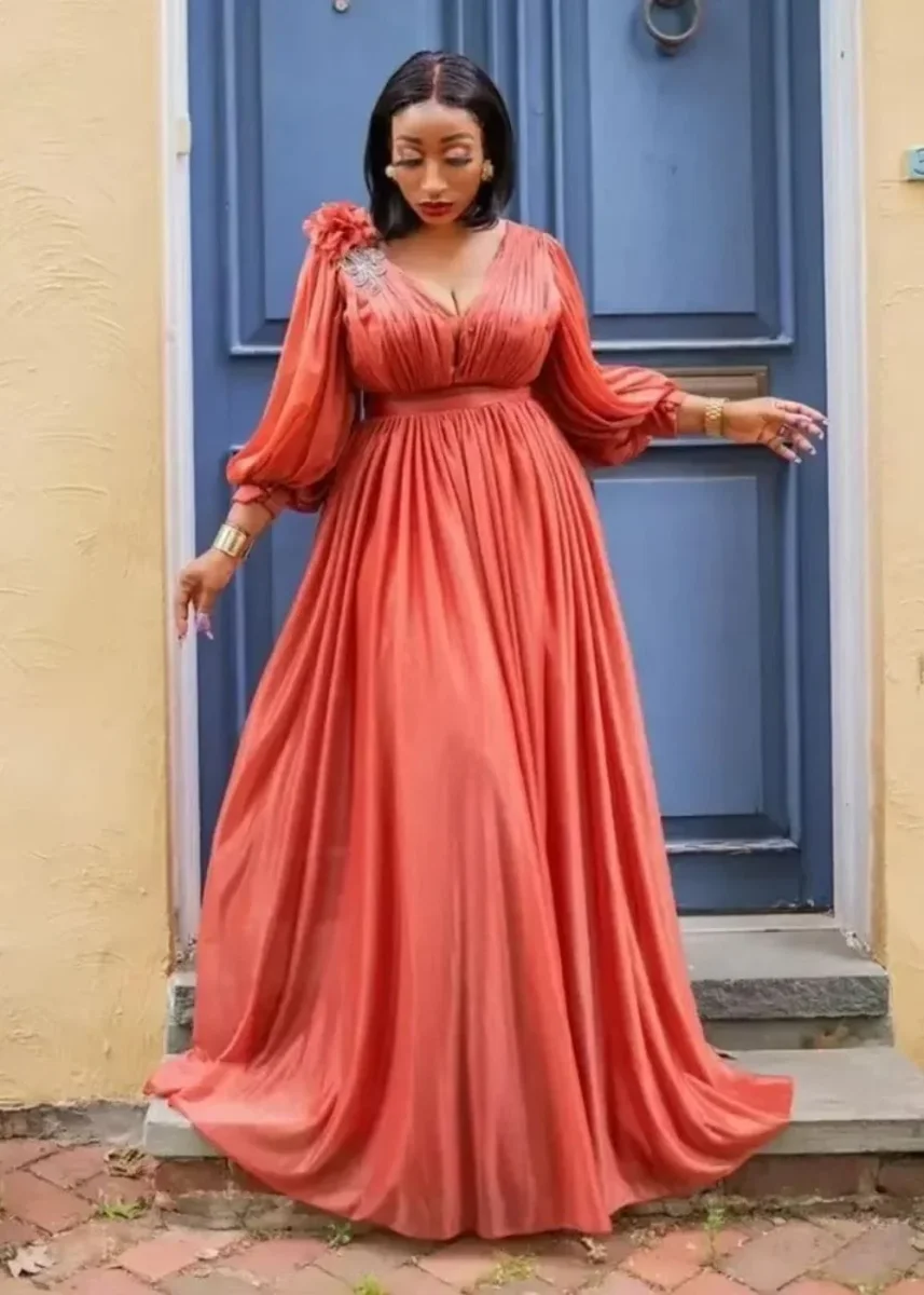 D’une teinte terracotta chaleureuse, cette robe évoque pleinement le raffinement et l’harmonie, idéale pour un mariage bohème ou une cérémonie chic. Ses manches bouffantes transparentes apportent une touche de romantisme tandis que les détails brodés ajoutent une finition luxueuse. Son décolleté en V flatteur encadre le visage avec grâce, parfait pour sublimer tes plus beaux accessoires.