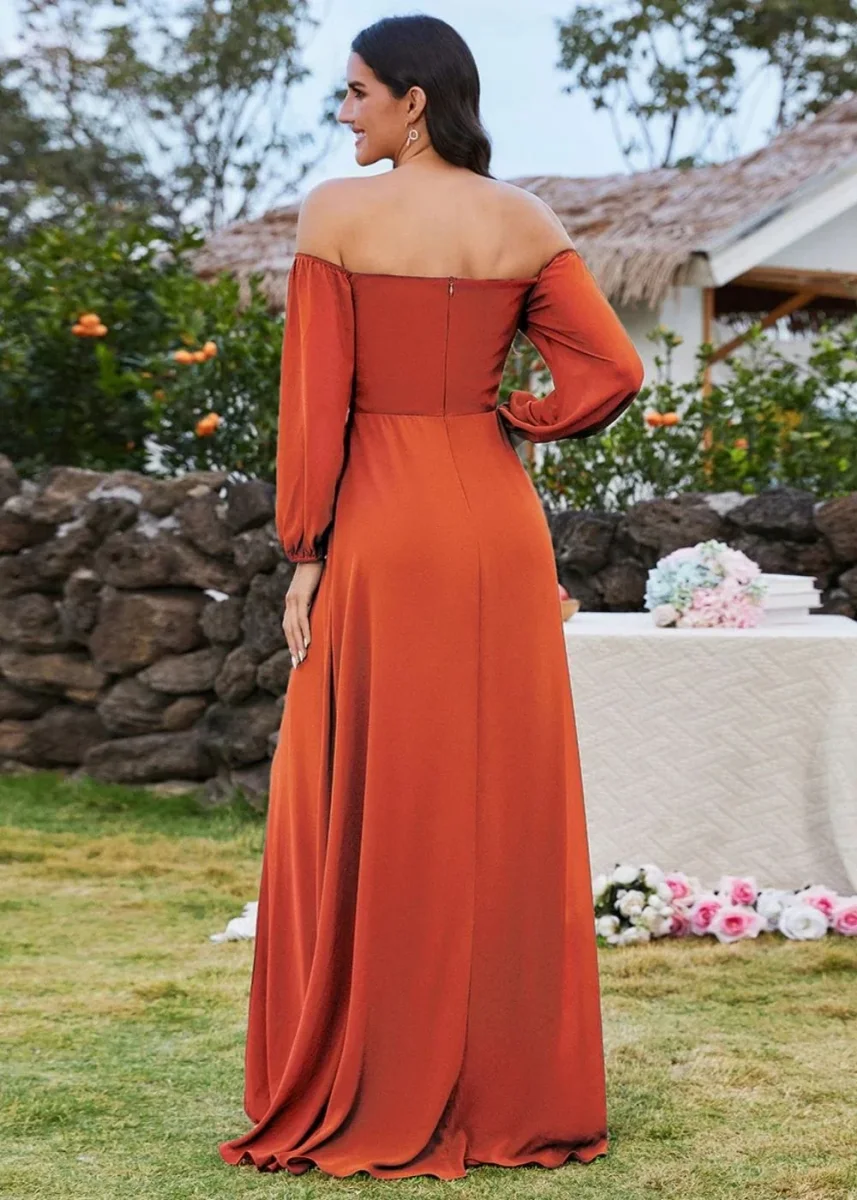 À la fois romantique et sophistiquée, cette robe terracotta mariage manche longue ne laisse personne indifférent. Son décolleté bardot met en valeur tes épaules avec grâce, tandis que la coupe fluide évoque pleinement une silhouette des plus avantageuses. La fente subtile ajoute une touche de sensualité discrète, parfaite pour une allure du plus bel effet.