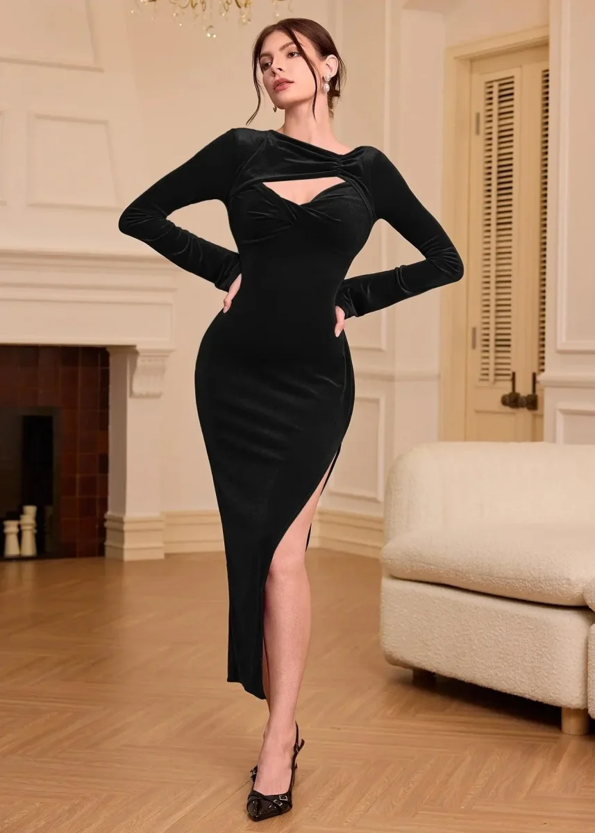 Faites sensation avec cette robe de soirée en velours, une pièce raffinée qui allie sophistication et sensualité. Sa coupe mi-longue met en valeur la silhouette, tandis que sa fente subtile apporte une touche glamour et moderne. Disponible en bordeaux ou en noir, elle s’adapte à toutes vos envies pour un look chic et intemporel. Ses manches longues et son tissu doux en velours en font une tenue idéale pour un dîner élégant ou une soirée habillée.