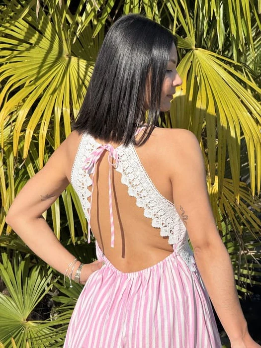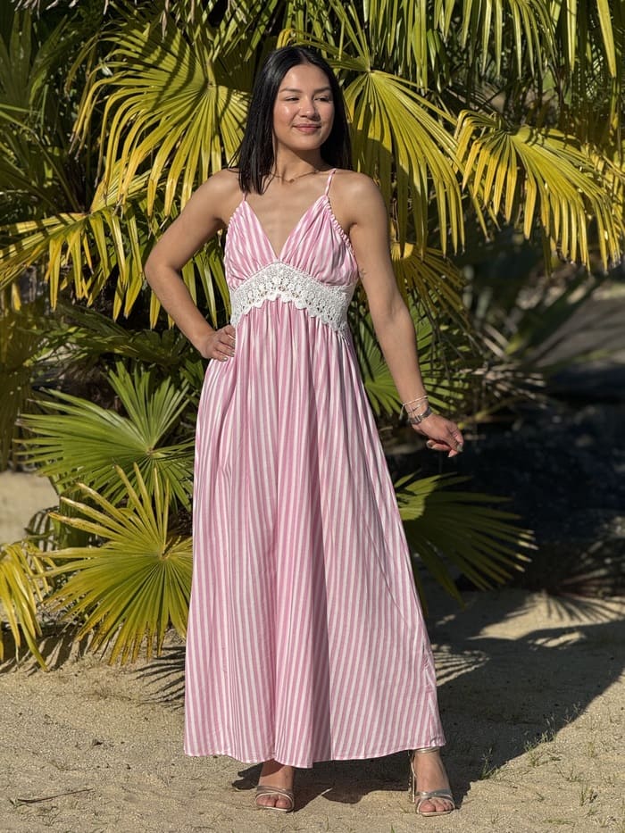 - Robe longue dos nu col v cache cœur – imprimé à rayures