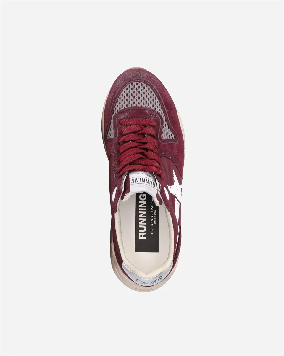 Baskets Running Sole de la marque Golden Goose en daim bordeaux. Détails en mesh et nylon. Étoile blanche sur le côté. Logo Golden Goose sur le contrefort. Lacets bordeaux. Semelle compensée beige. Effet vintage. Fait main en Italie.