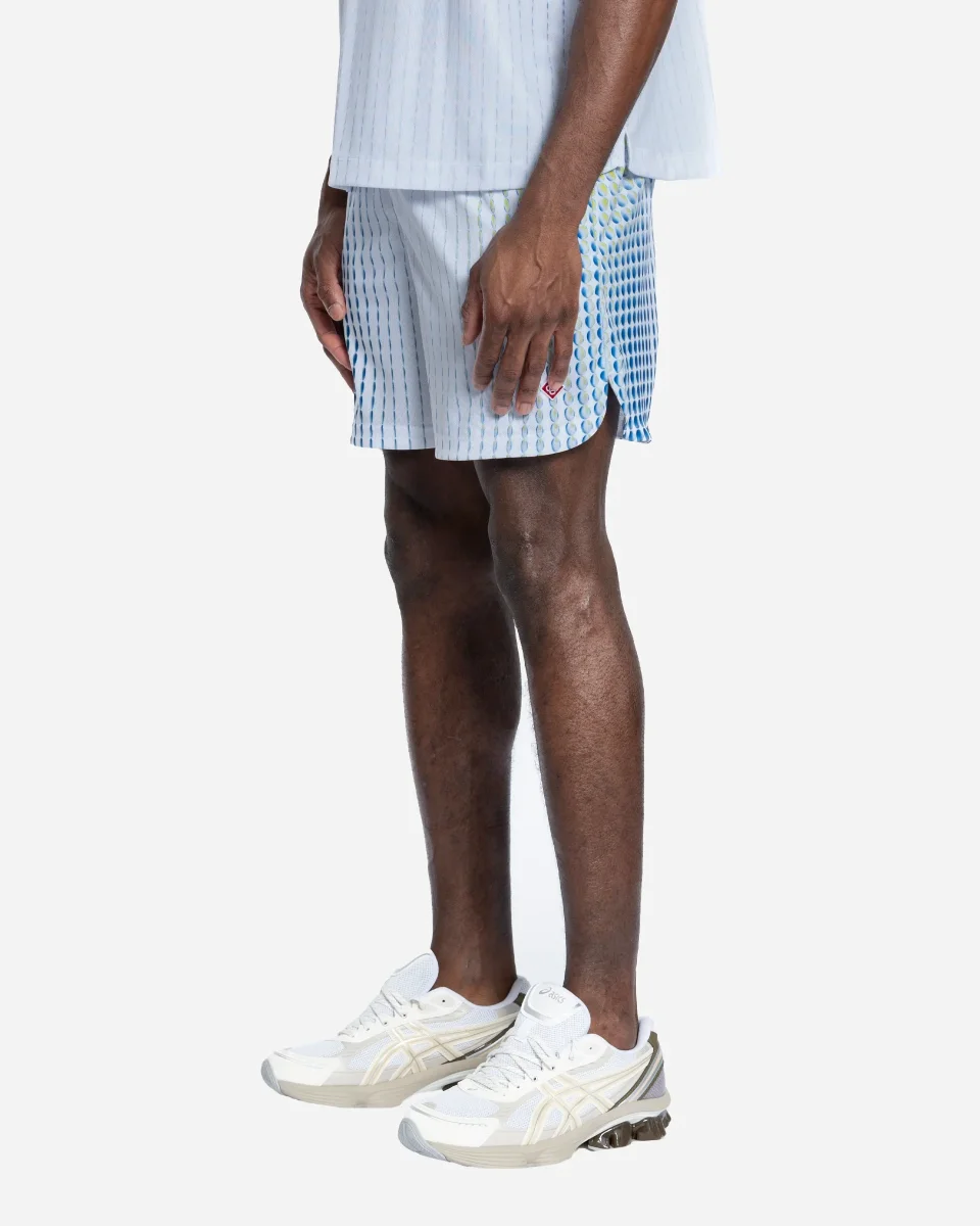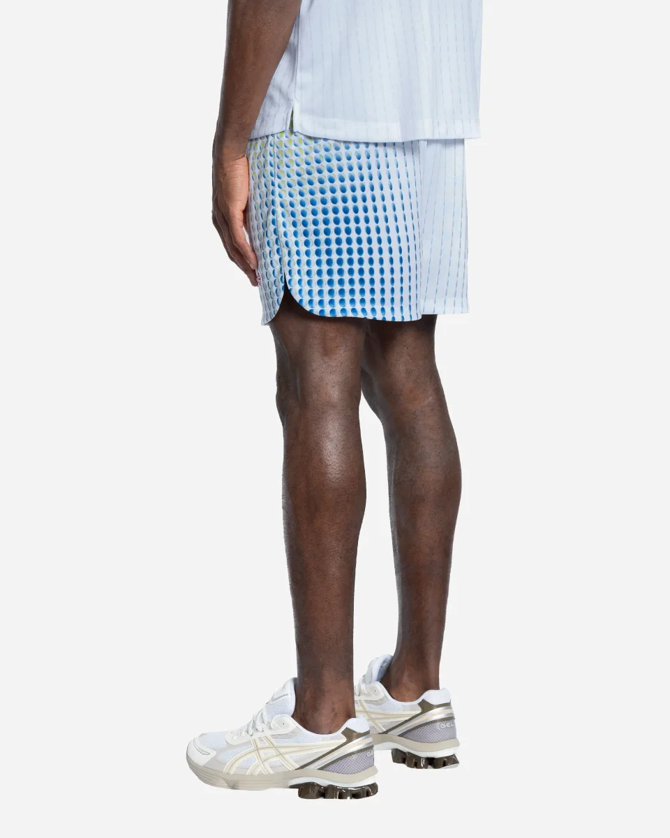 Ce short technique est confectionné dans un mesh birdseye, un tissu léger et texturé offrant une excellente respirabilité. Fidèle à l’esthétique sport de luxe de la maison, il présente un imprimé graphique à pois dégradés dans des nuances de bleu et de vert, assorti au t-shirt de la même ligne. Le design se caractérise par une coupe décontractée avec une taille élastiquée munie d’un cordon de serrage, des poches latérales et une finition arrondie sur le bas de la jambe. L’emblématique écusson logo diamant de Casablanca est appliqué sur le devant. Fabriqué au Portugal, ce modèle allie confort et performance pour le court ou la ville.