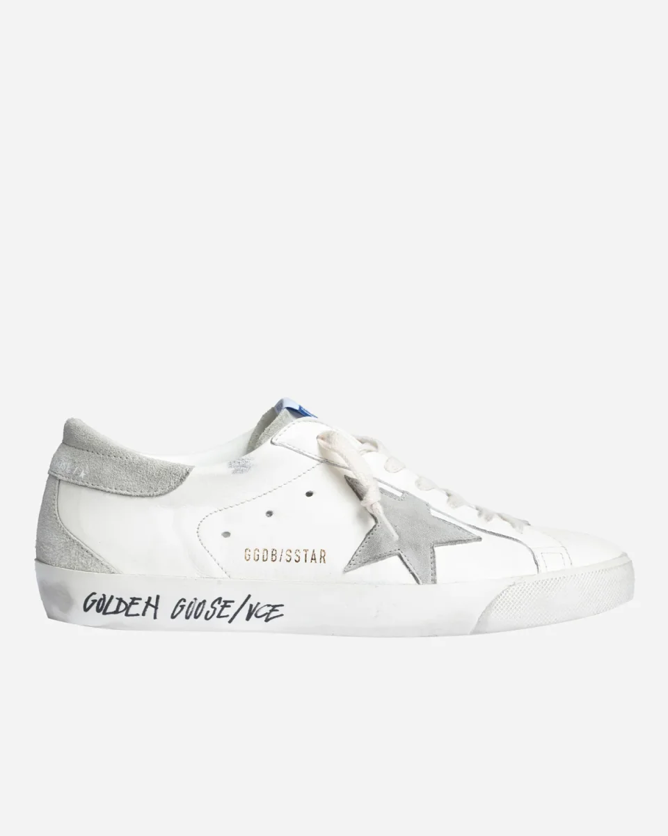 Super-Star en cuir blanc étoile en cuir suédé gris arrière en cuir suédé gris avec des lacets crème et une languette en cuir.