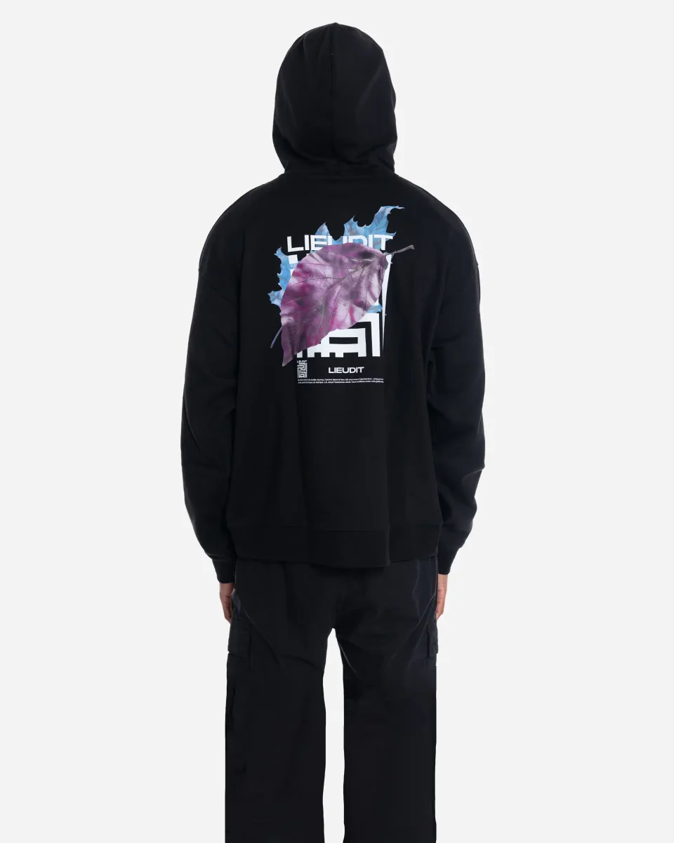 Sweatshirt à capuche classique, logo Lieu-Dit sur la poitrine en blanc. Grand imprimé graphique au dos associant le logo géométrique de la marque à un visuel de feuille aux reflets violets et bleus, complété par une citation sur la nature et l’éphémère.