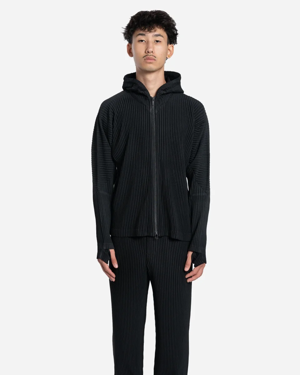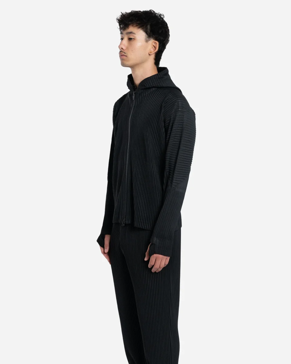Sweat à capuche, Homme Plissé Issey Miyake, zippé, plissé, noir, manches longues, poignets passe-pouces, poches latérales