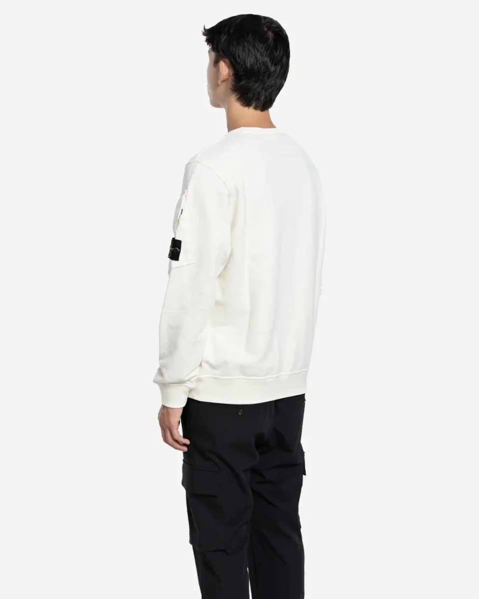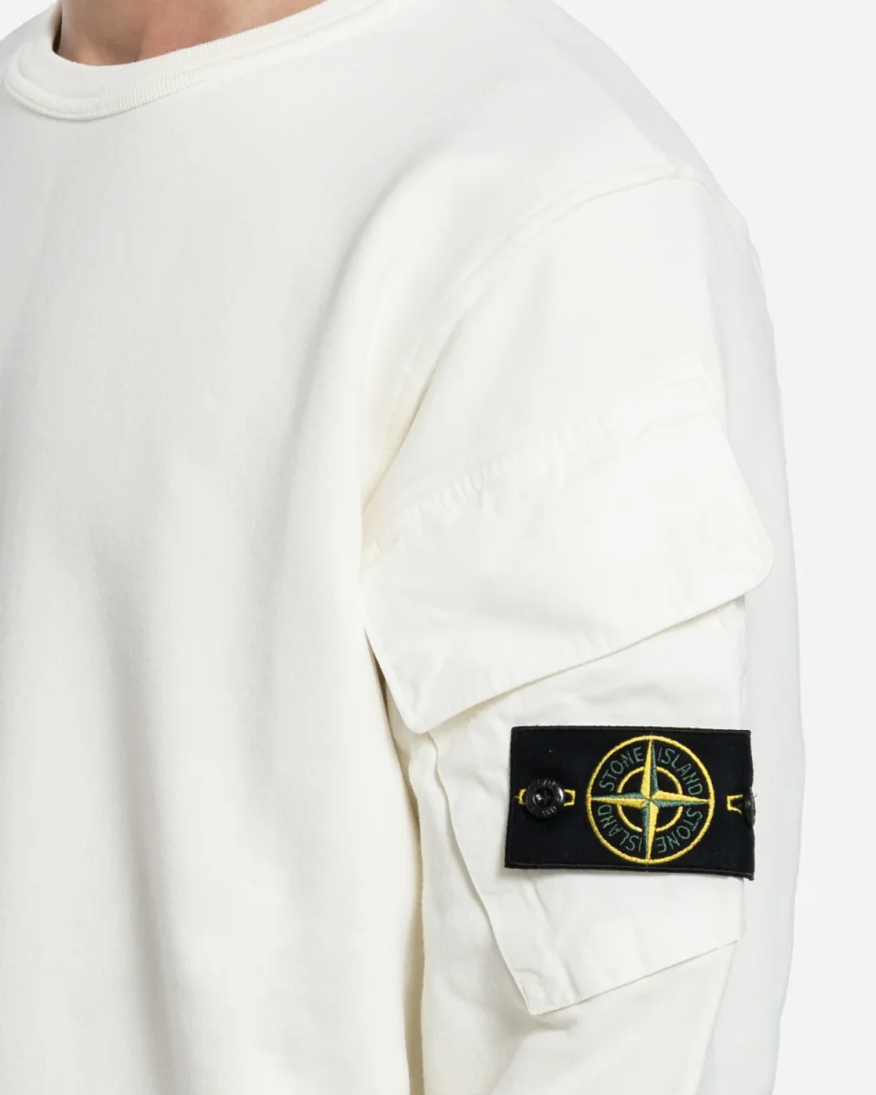 C’est le sweatshirt couleur Ivory de Stone Island. Il possède une poche sur chaque bras, dont la gauche possède un logo.