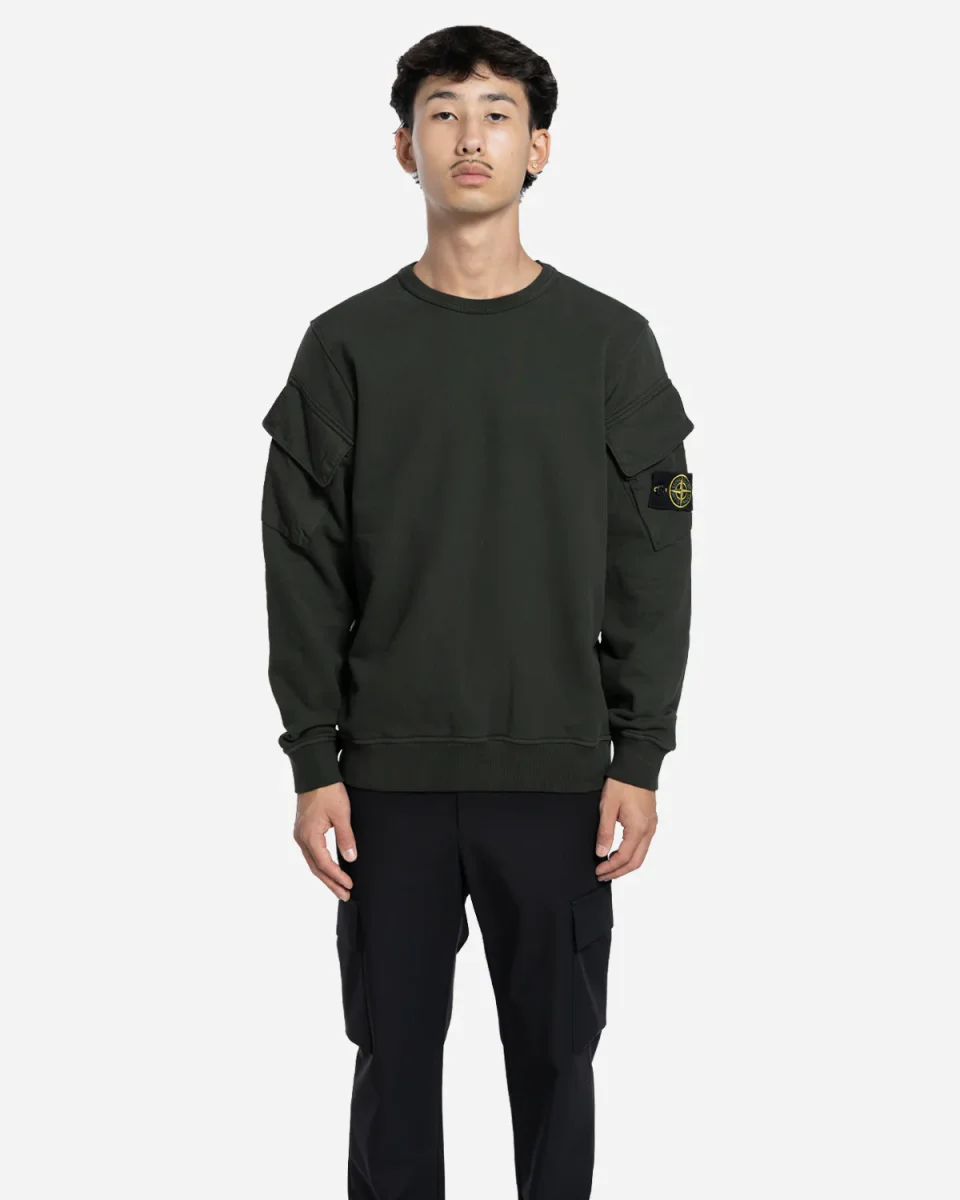 C’est le sweatshirt couleur Juniper de Stone Island. Il possède une poche sur chaque bras, dont la gauche possède un logo.