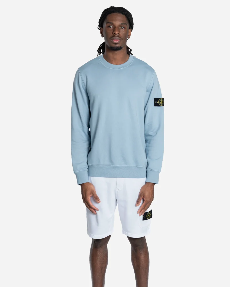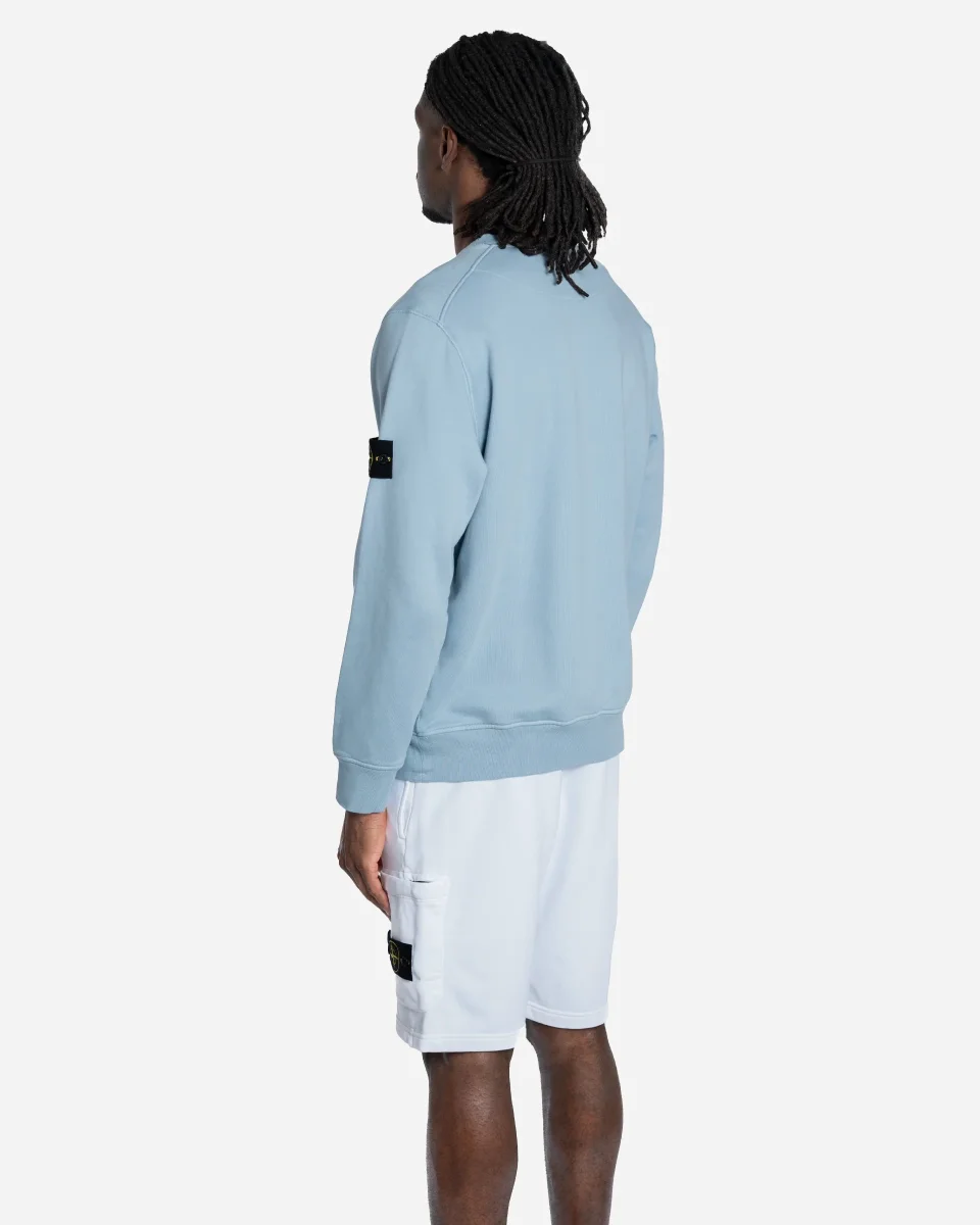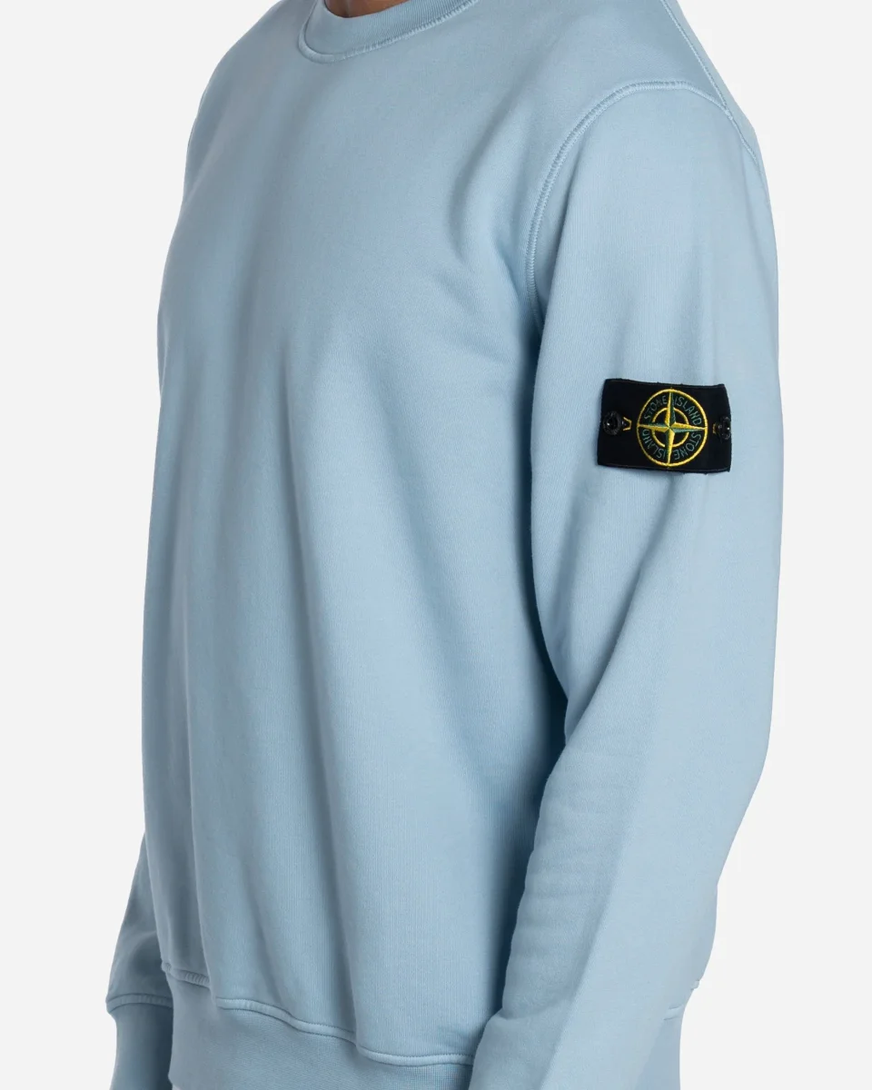 Sweat-shirt, Stone Island, Coton biologique, Bleu Poussière, Manches raglan, Teint en pièce, Molleton, Badge boussole, Regular fit, Sportswear de luxe.