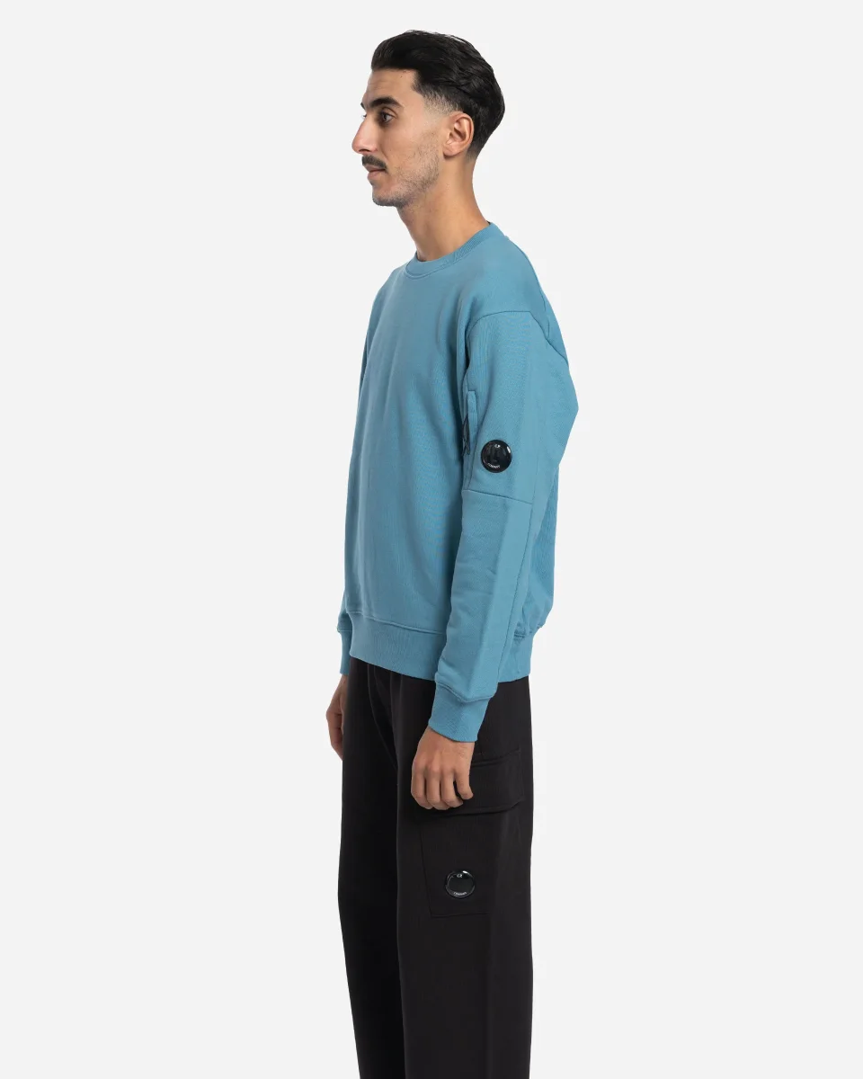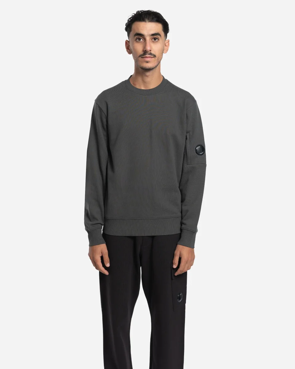Sweat, col rond, C.P. Company, polaire relief diagonal, coton brossé, logo brodé, lentille emblématique, poignets côtelés, coupe régulière, minimaliste.