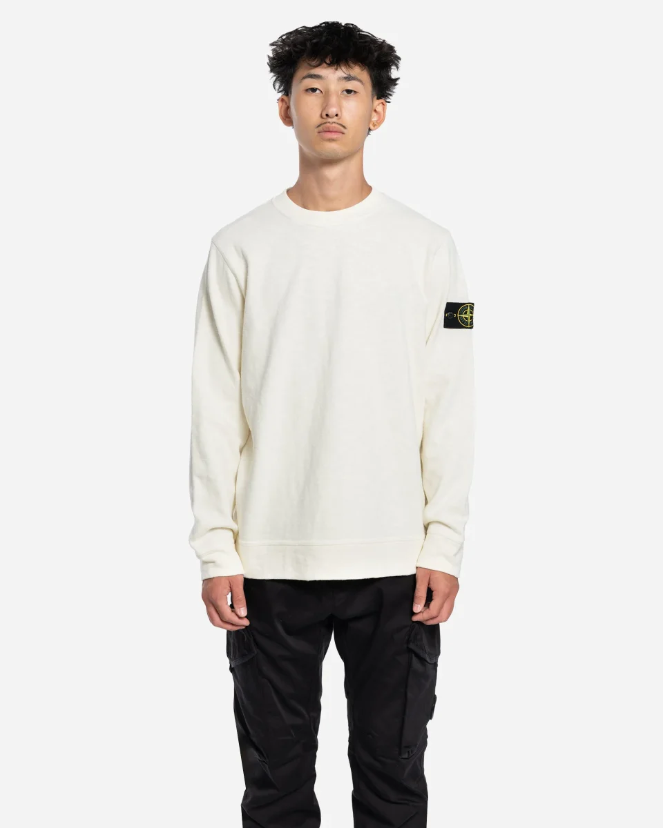 Stone Island, sweat-shirt, col rond, ivoire, logo manche, patch noir et jaune, manches raglan, molleton léger