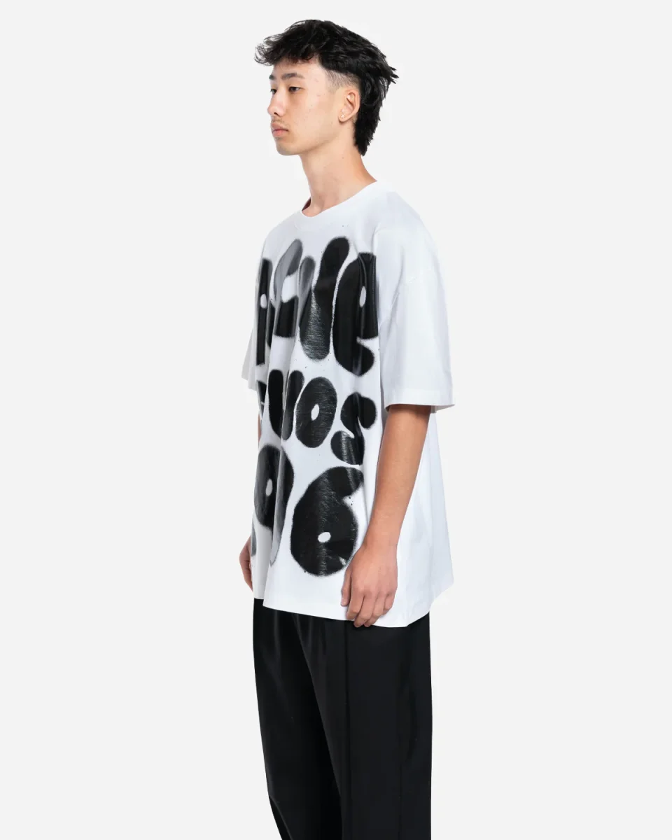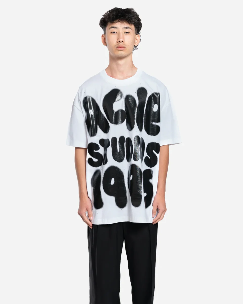 T-shirt, col rond, jersey de coton biologique, mi-épais, coupe unisexe, décontractée, logo, effet spray, Acne Studios 1996