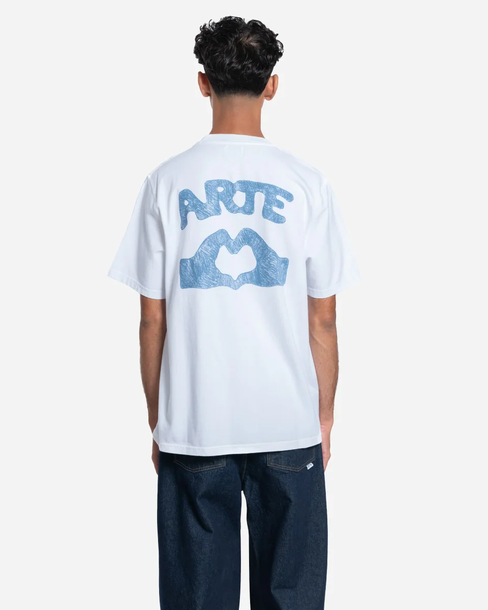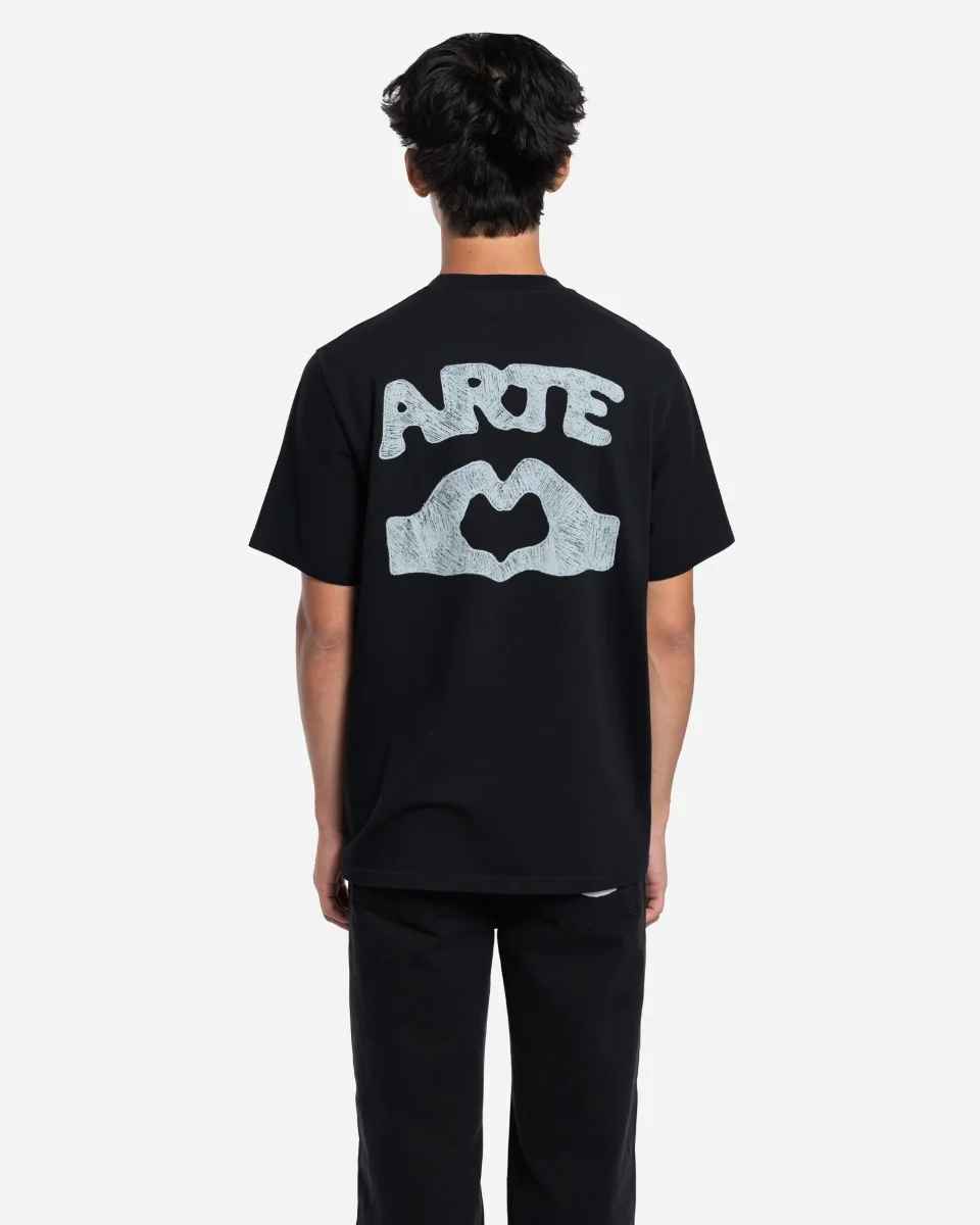 Ce t-shirt noir de la marque Arte présente une coupe décontractée et un col légèrement montant. Il est uni à l’avant et décoré à l’arrière d’un grand motif imprimé en blanc représentant le logo Arte au-dessus d’un cœur formé par deux mains. Fabriqué en coton épais, il est doux et agréable à porter.