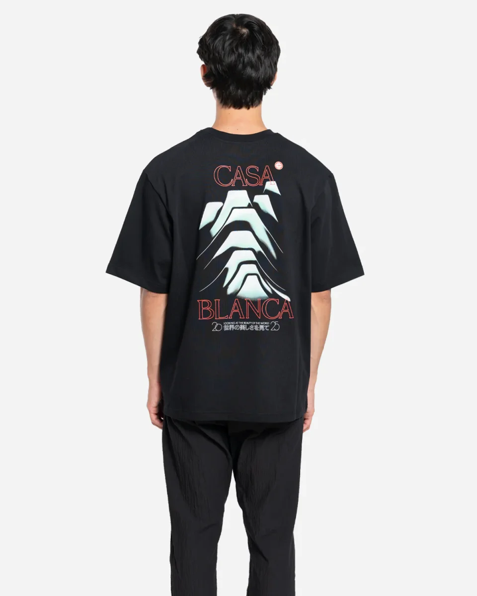 T-shirt, coton biologique, noir, coupe oversize, imprimé, Frosty Mountain, visuel coloré, paysages stylisés, influences méditerranéennes, art graphique, matière douce, confortable, élégance décontractée, esprit sportif