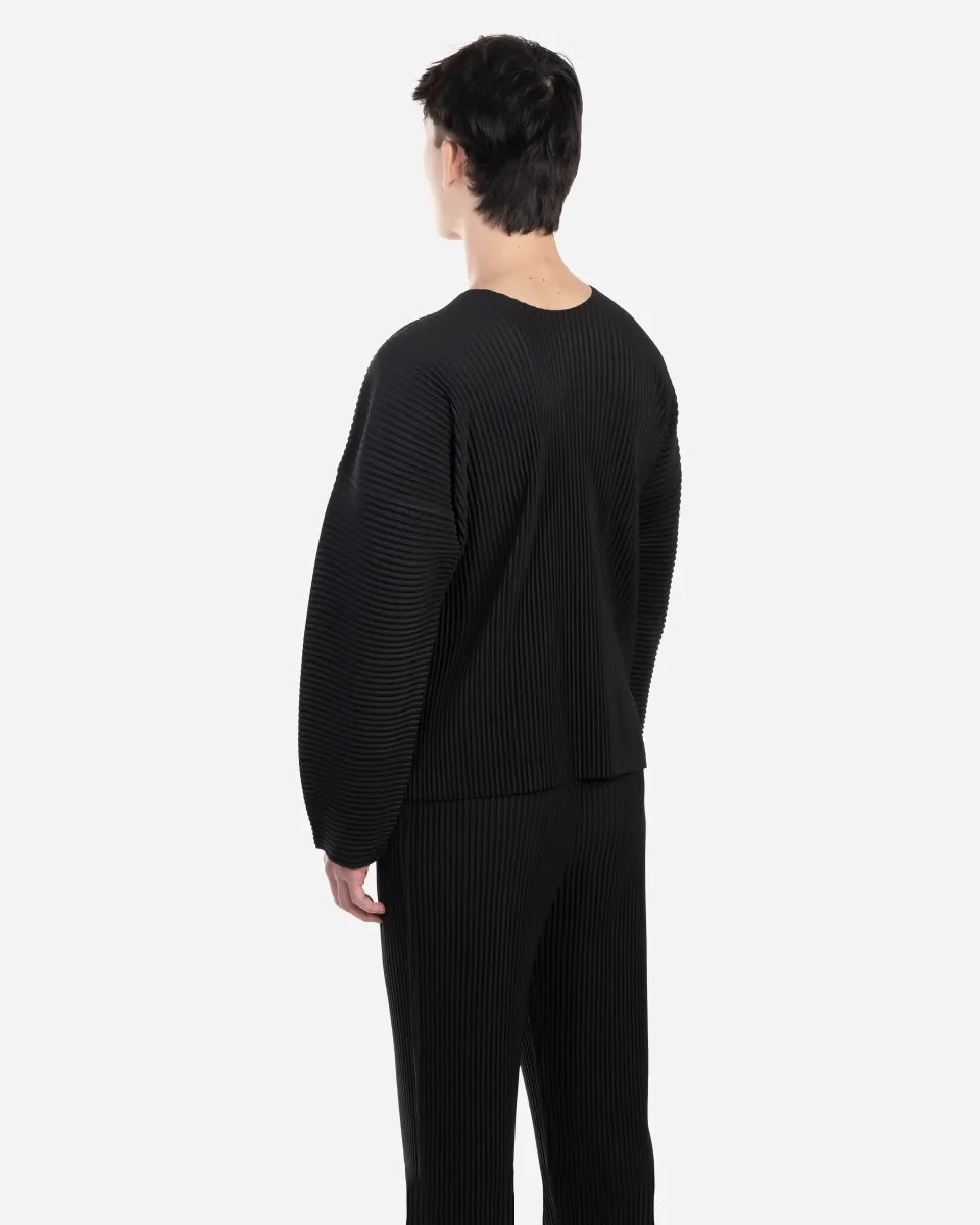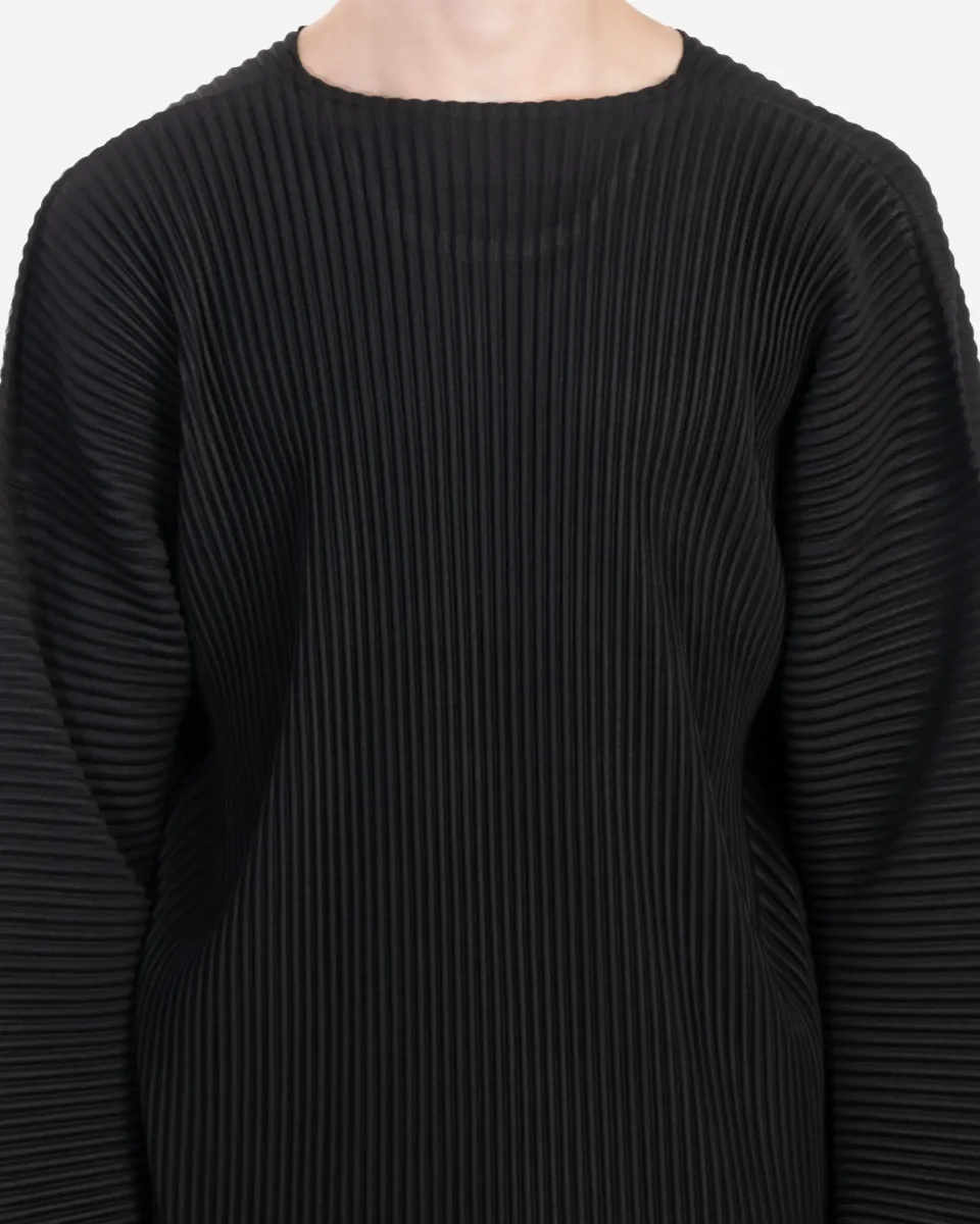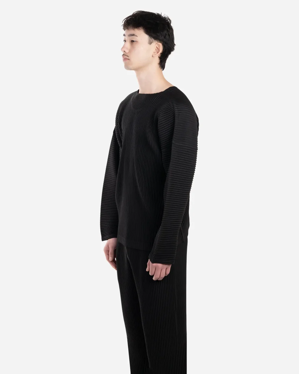 T-shirt de la marque Homme Plissé Issey Miyake en noir. Ce modèle présente le plissage signature léger et infroissable de la maison sur l’ensemble du vêtement. Col rond et manches longues.