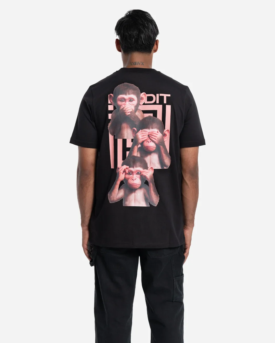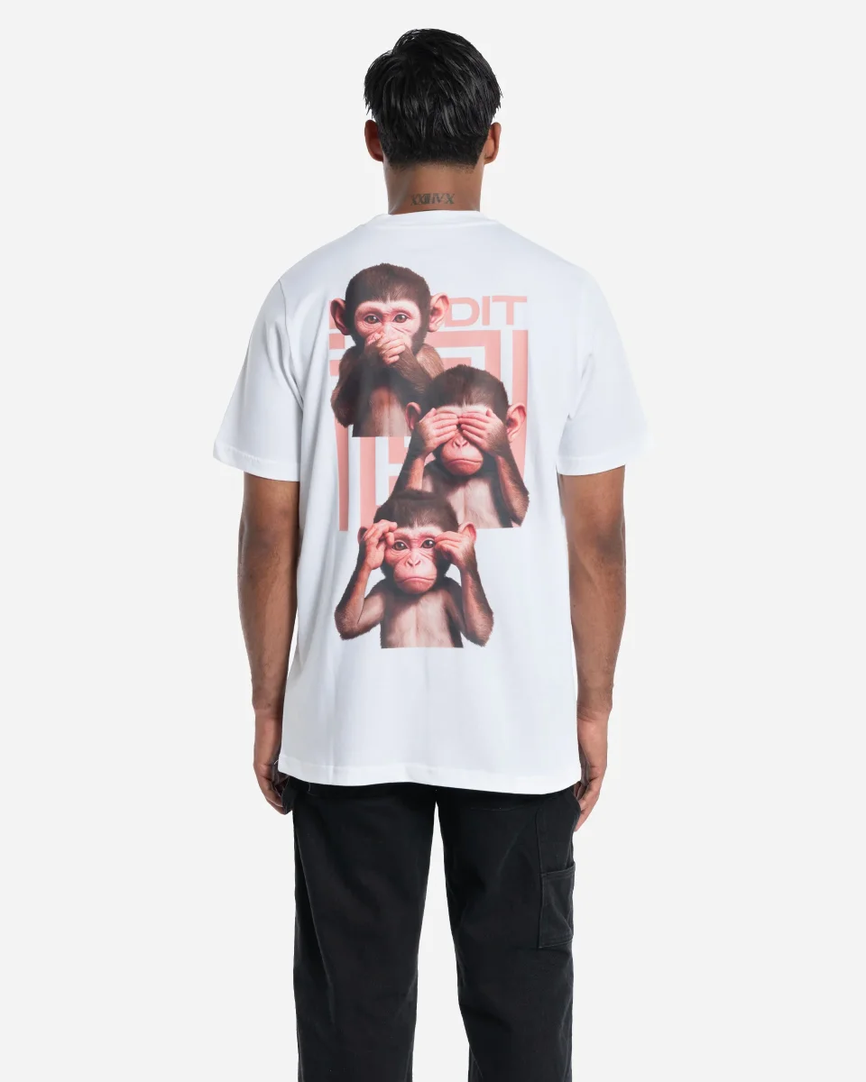 T-shirt blanc à coupe droite avec un petit logo imprimé sur la poitrine. Dans le dos, un grand motif coloré représente trois singes dans les positions classiques « ne rien entendre, ne rien voir, ne rien dire ». Un t-shirt original et facile à porter, parfait pour un style décontracté au quotidien.