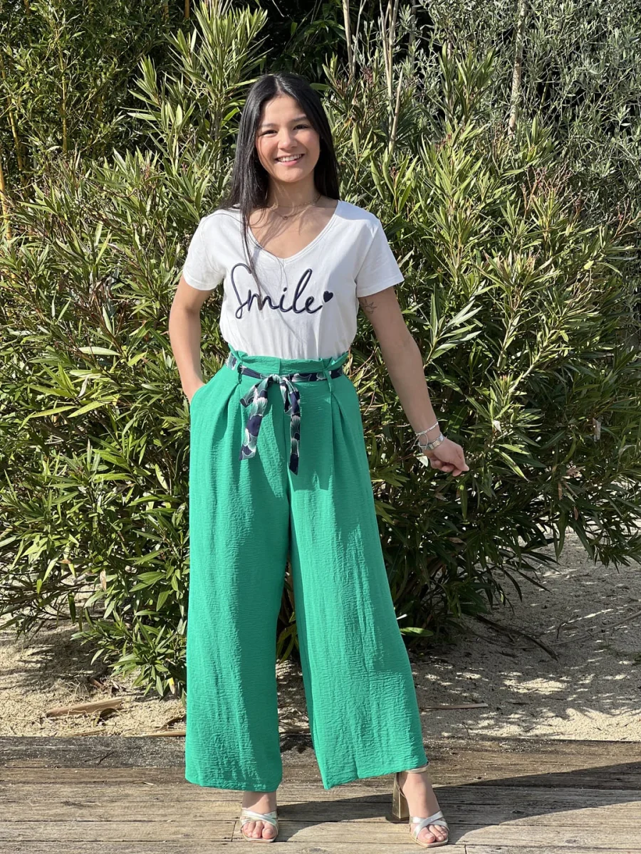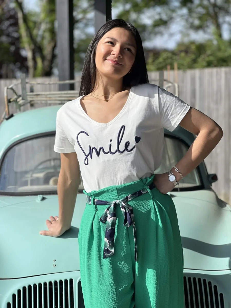 - T-SHIRT À COL V INSCRIPTION SMILE AVEC CŒUR