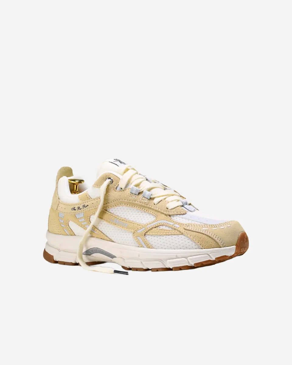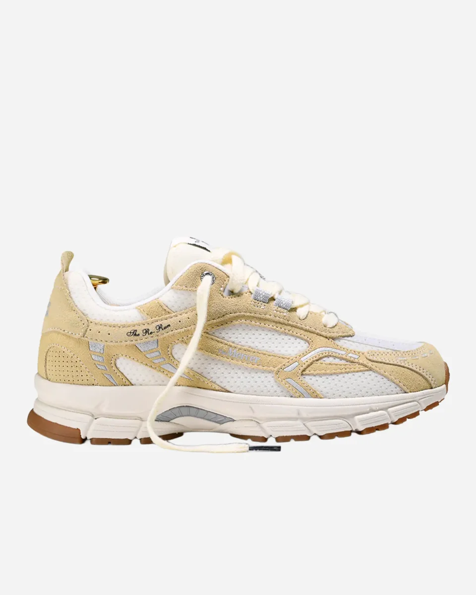 Re-Run Vintage, sneakers rétro, semelle jaunie, daim recyclé GRS, maille recyclée, EVA, caoutchouc recyclé, baskets responsables, style vintage, chaussures urbaines