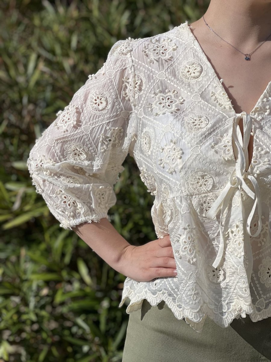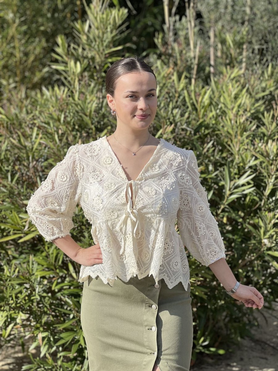 - Top à manche 3/4 – nœud devant + broderie