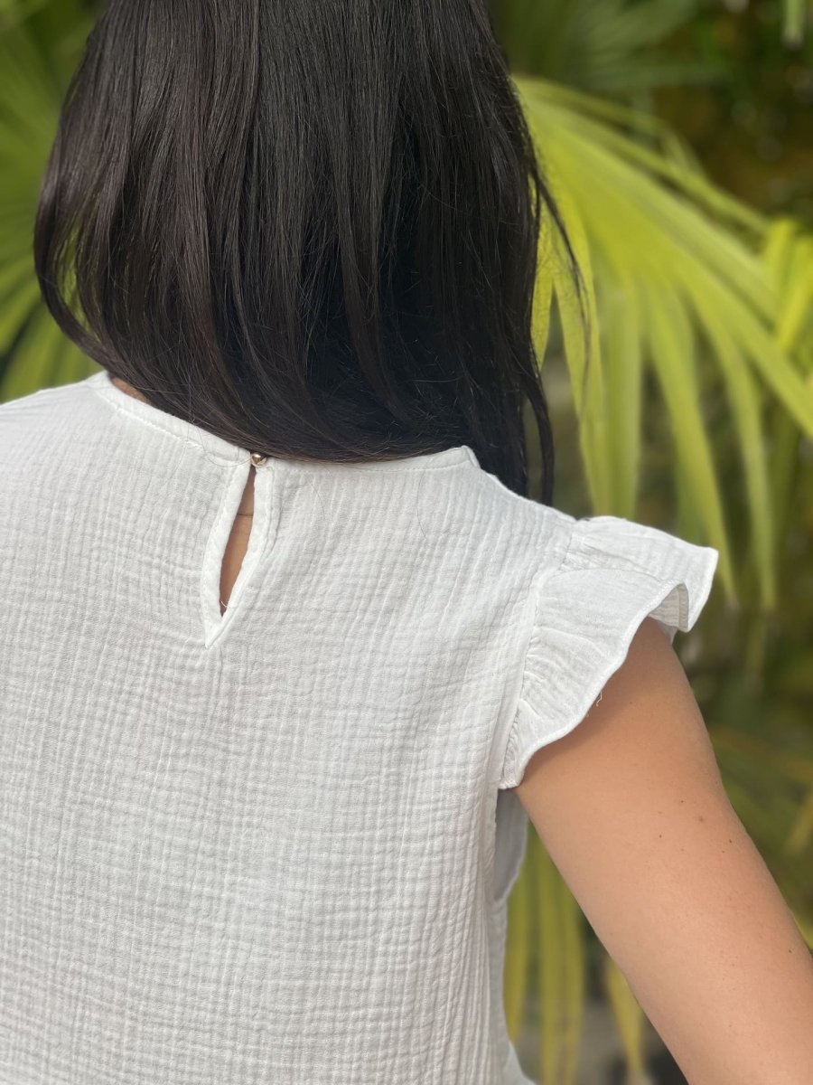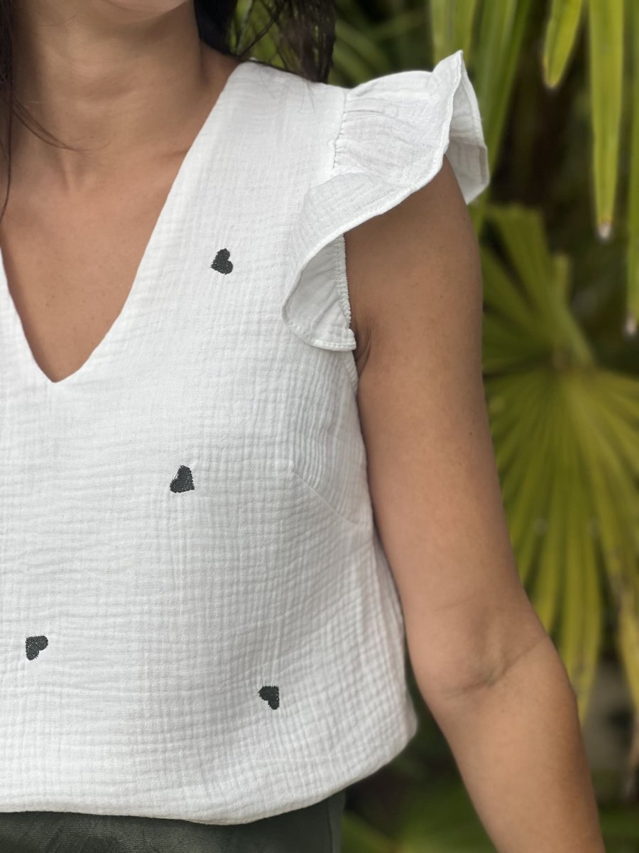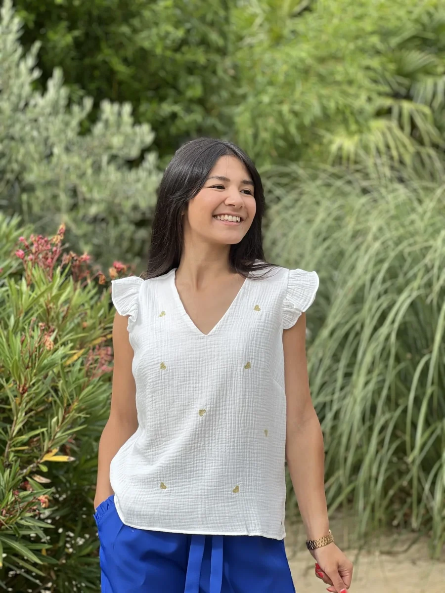 - Top à mc froufrou col v en gaze de coton – imprimé petites cœurs gold