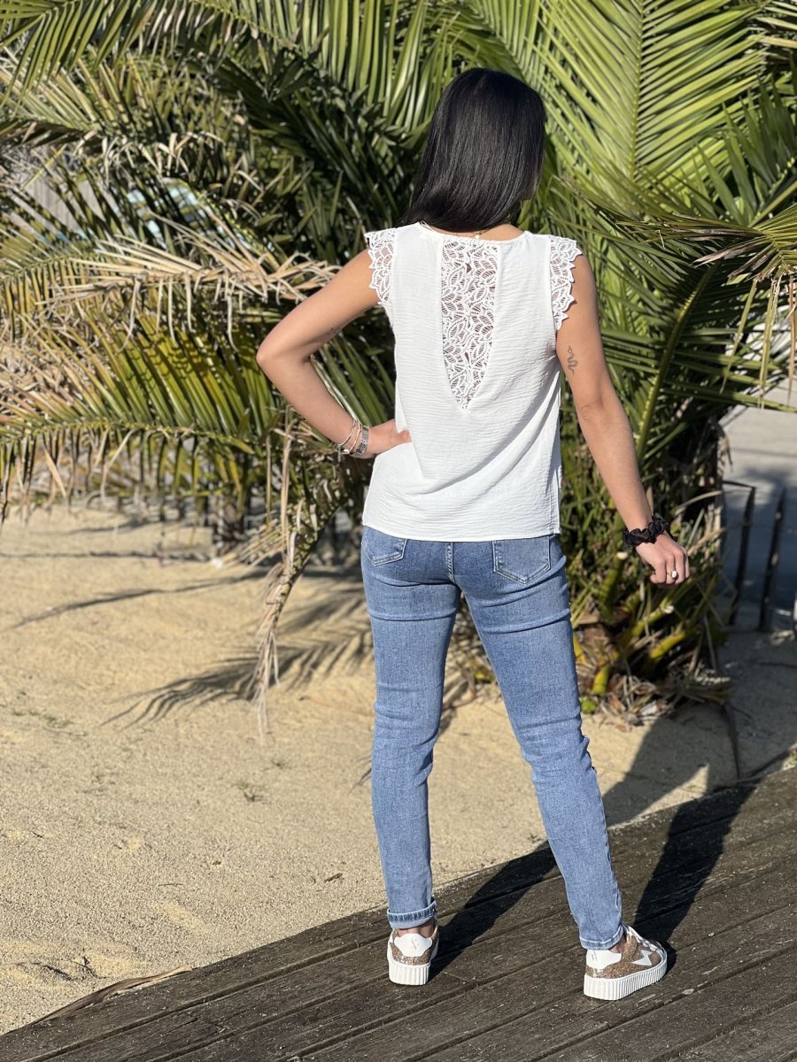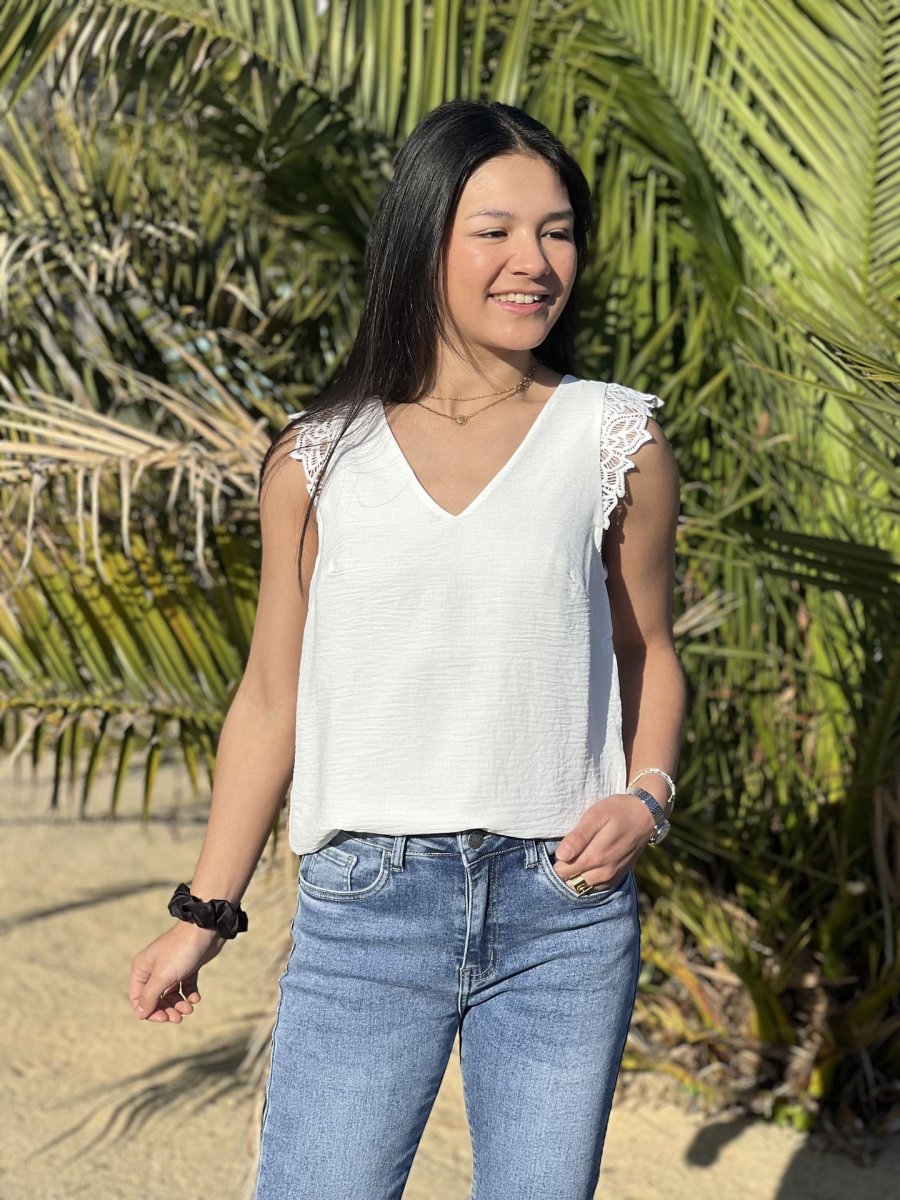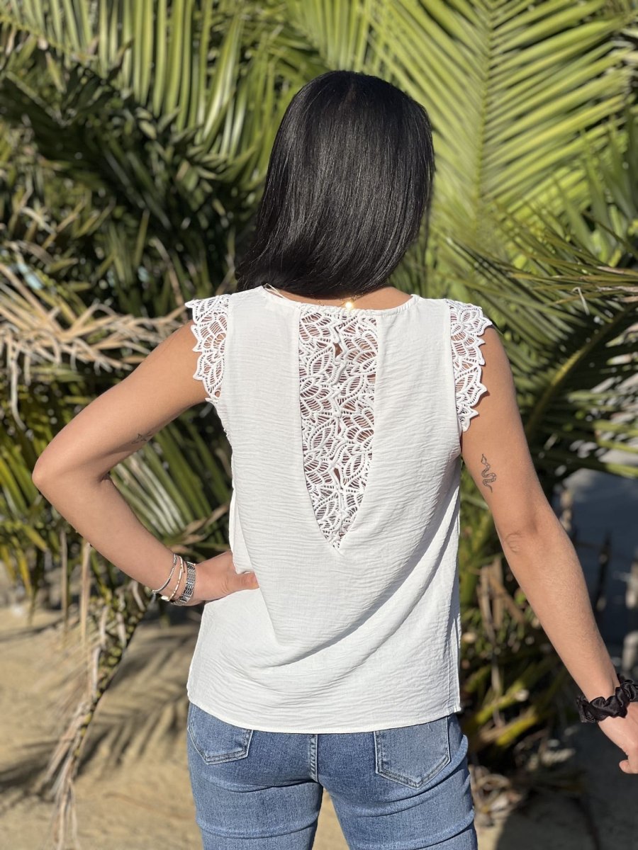 • TOP SANS MANCHE FROUFROU – COL V AVEC DENTELLE – NEOUD AU DOS