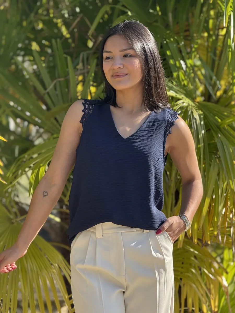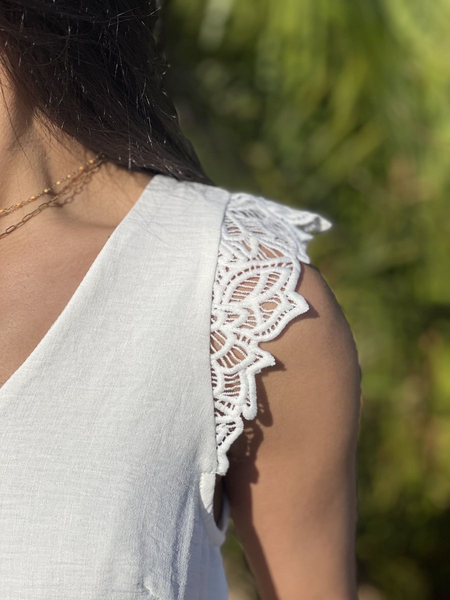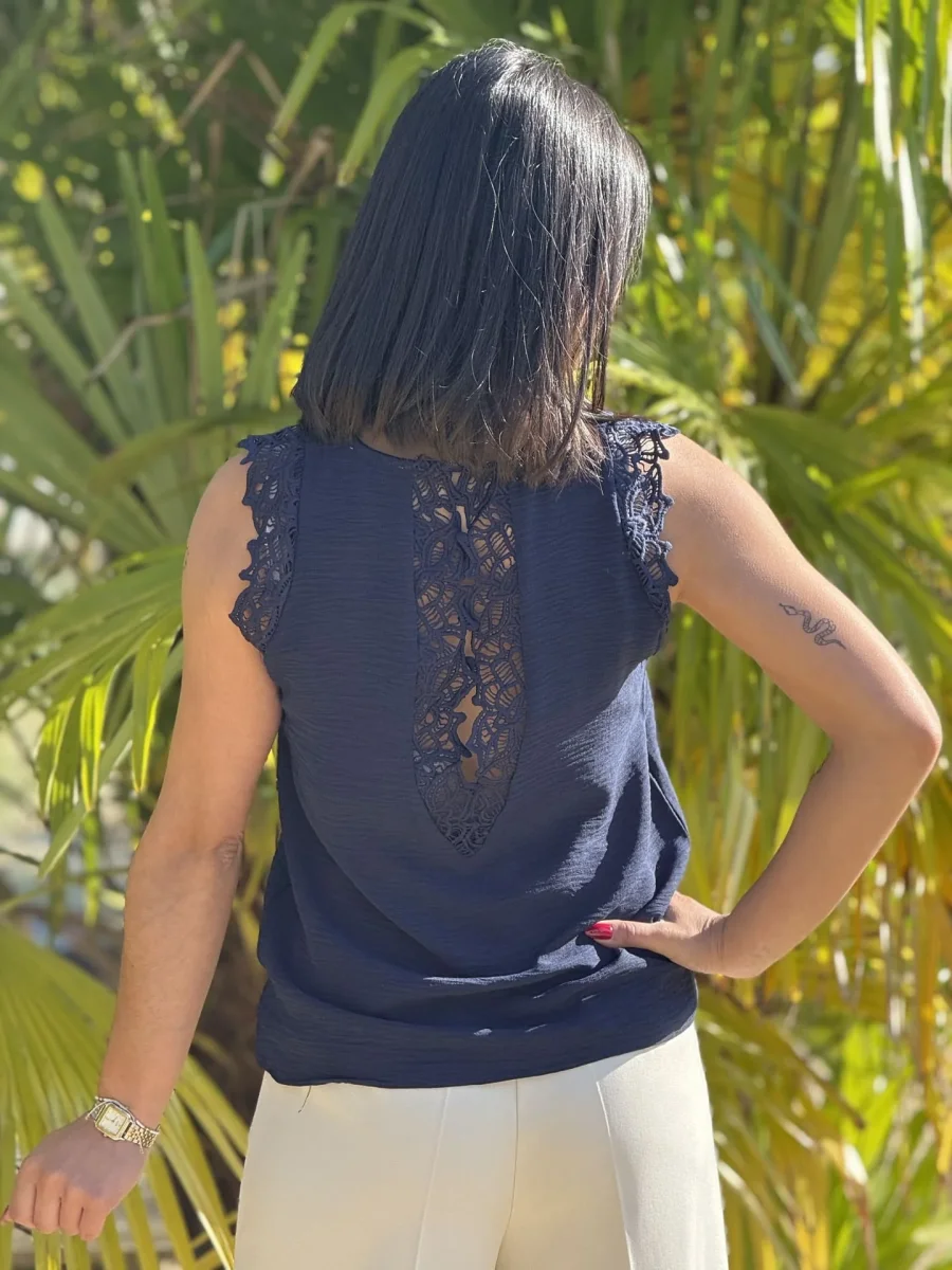 • TOP SANS MANCHE FROUFROU – COL V AVEC DENTELLE – NEOUD AU DOS