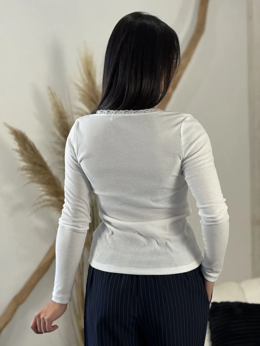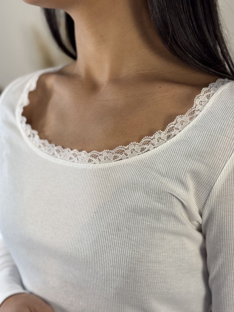 - TOP À ML cotelé col rond avec liseret dentelle