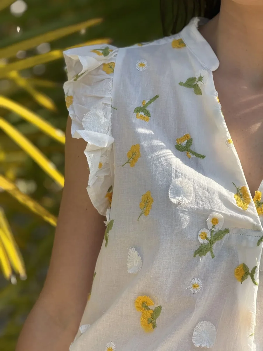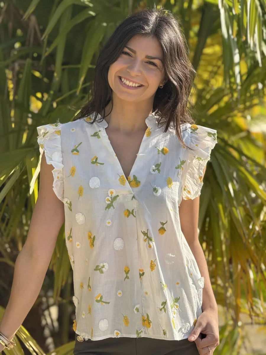 - Top à mc froufrou col v mao + imprimé petites fleurs jaunes