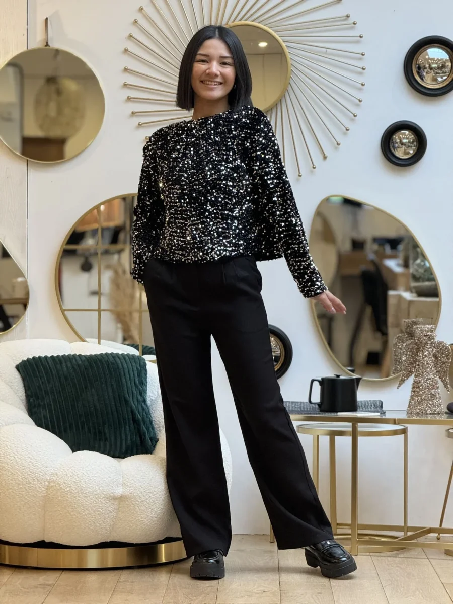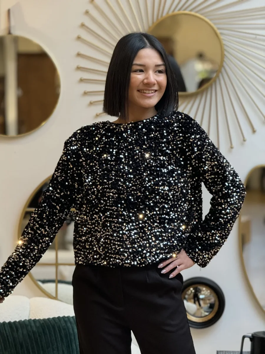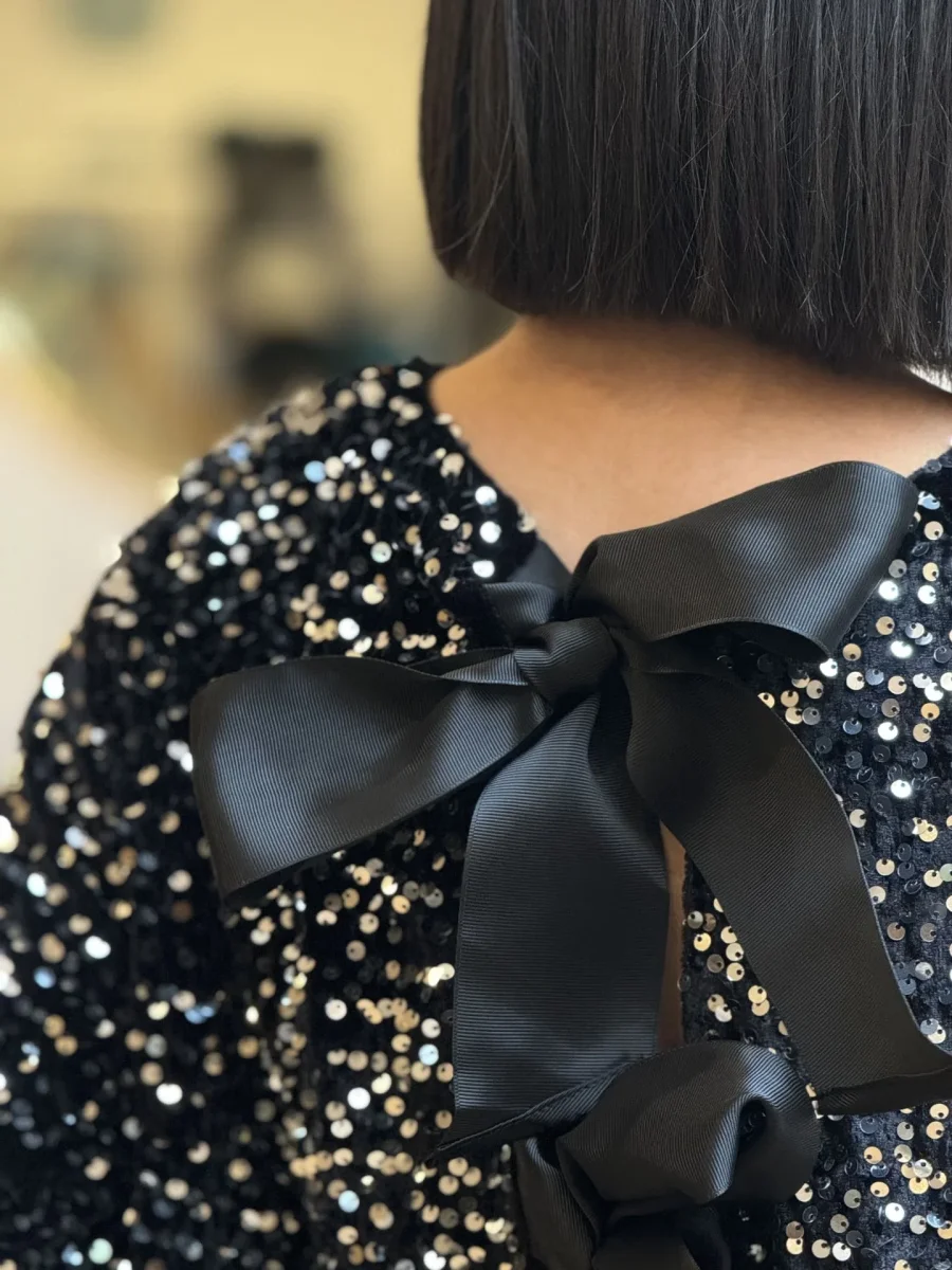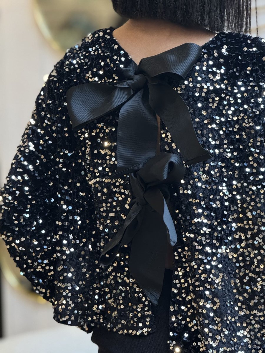 - TOP À ML COL ROND À SEQUINS – GROS NŒUDS AU DOS
