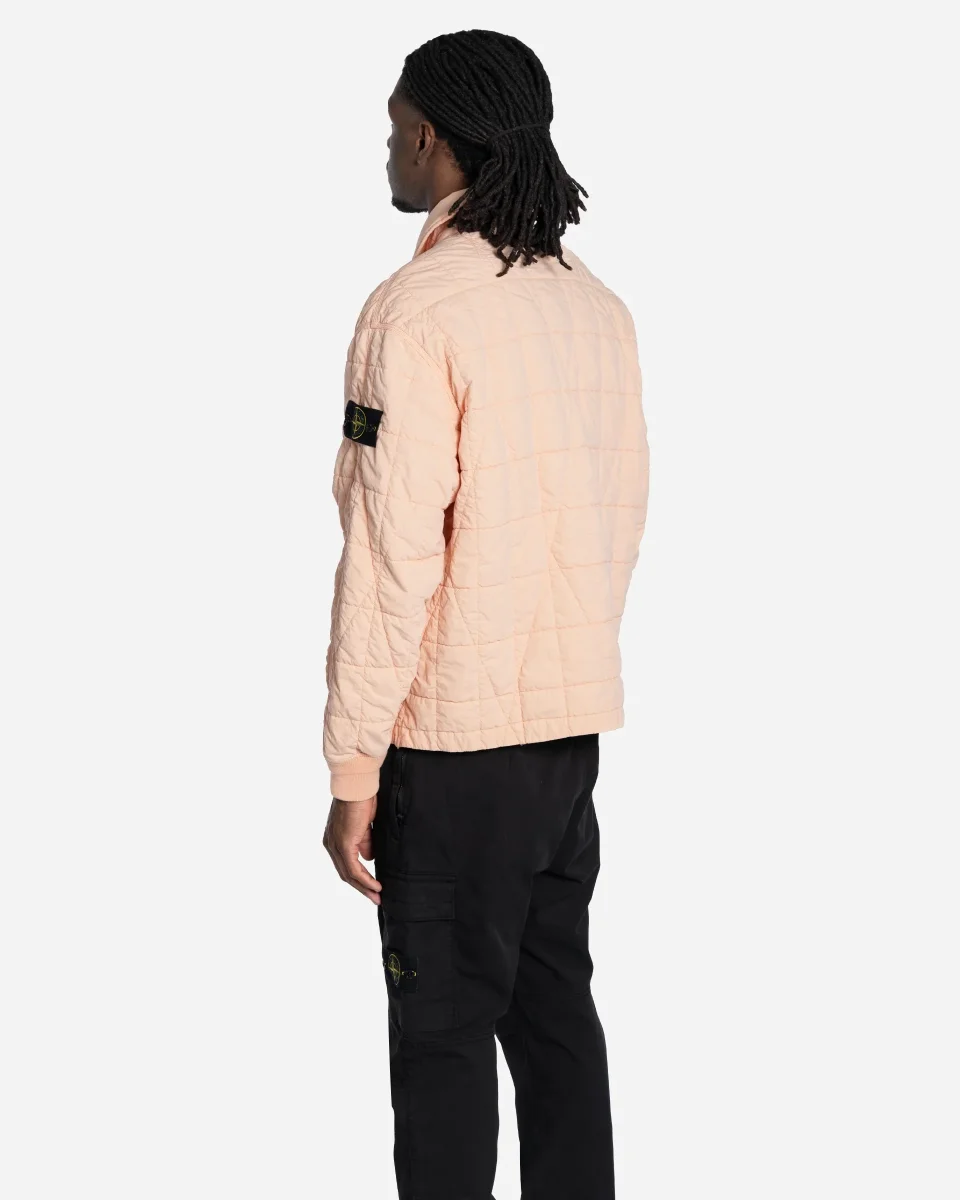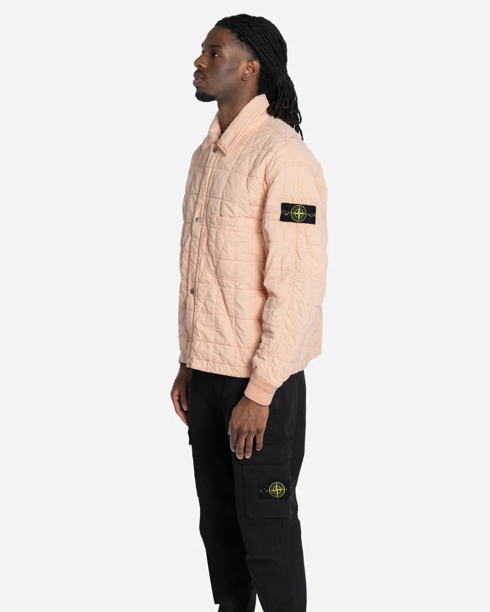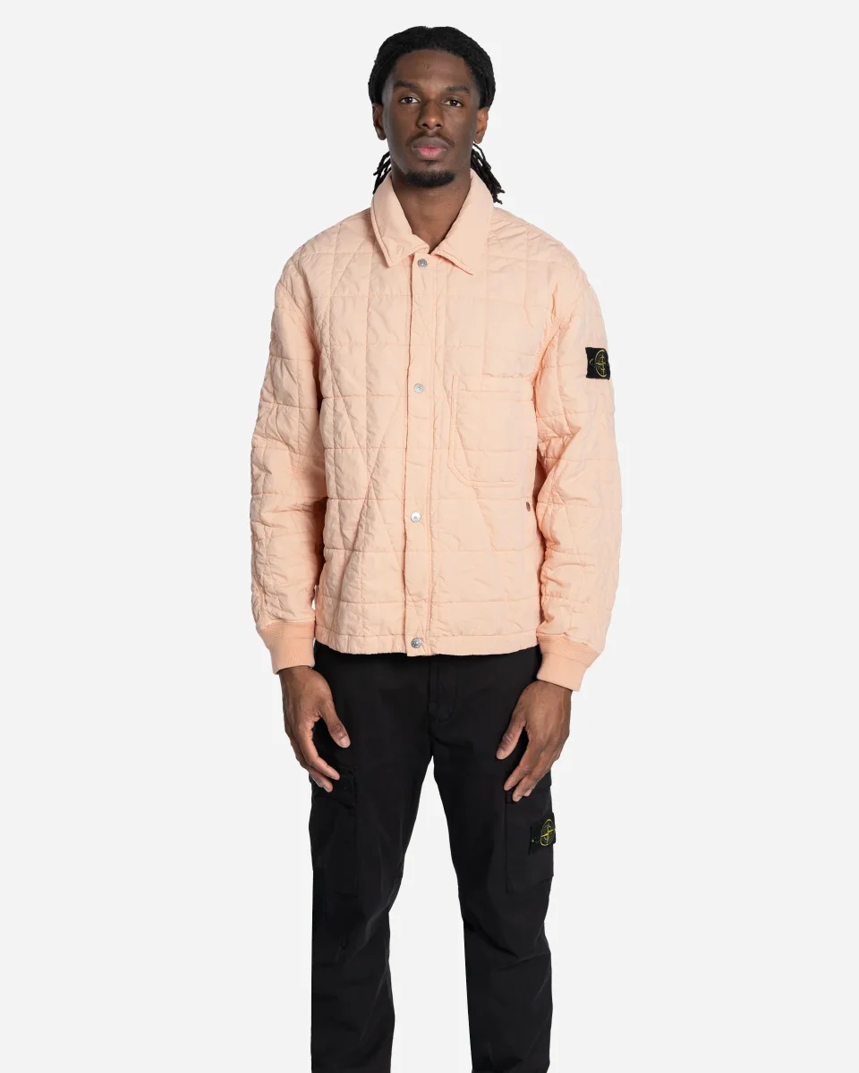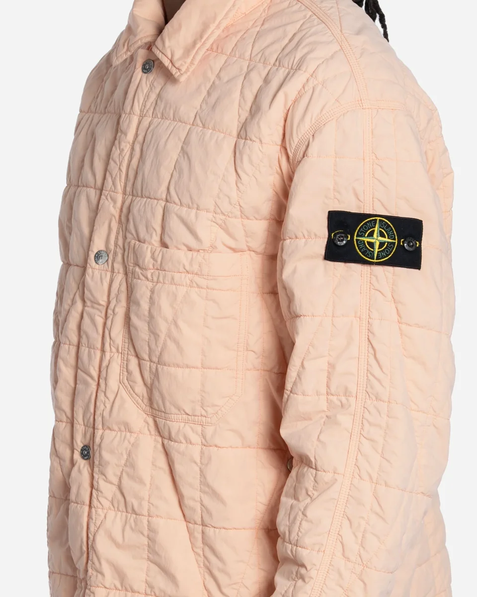 Veste coach, Stone Island, matelassée, PrimaLoft-TC, coton biologique, nylon recyclé, déperlant, teint en pièce, luxe technique, beige.