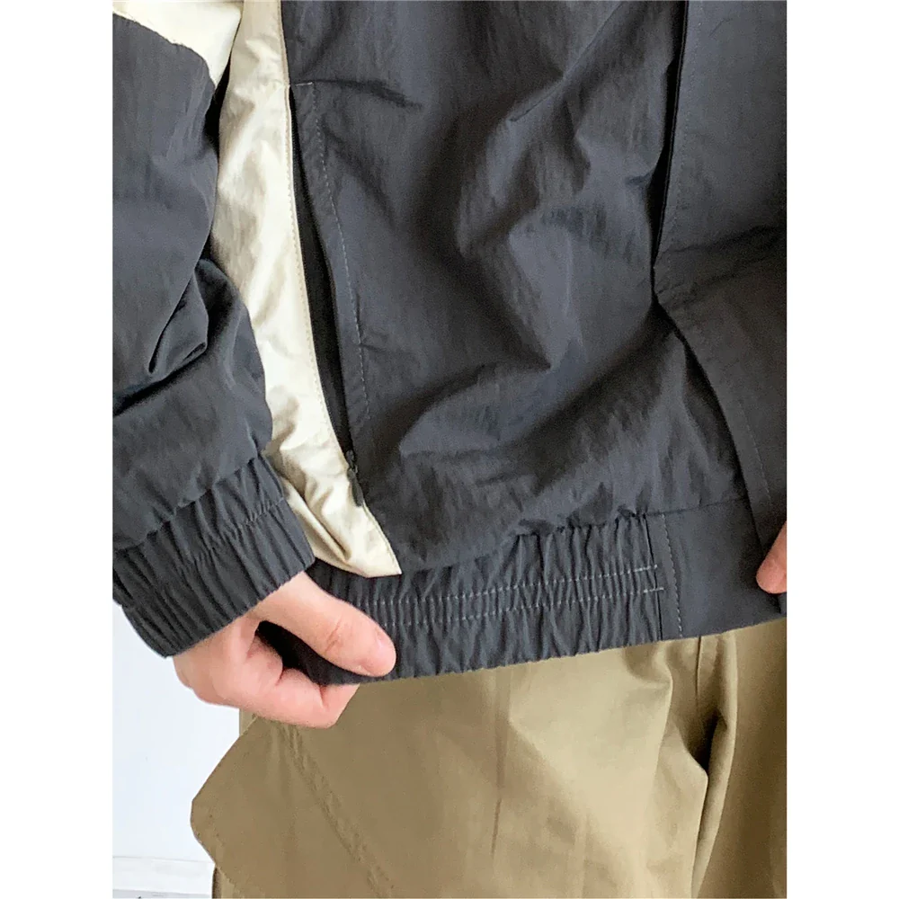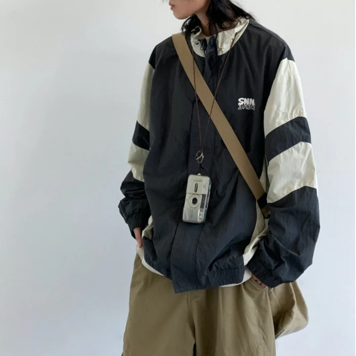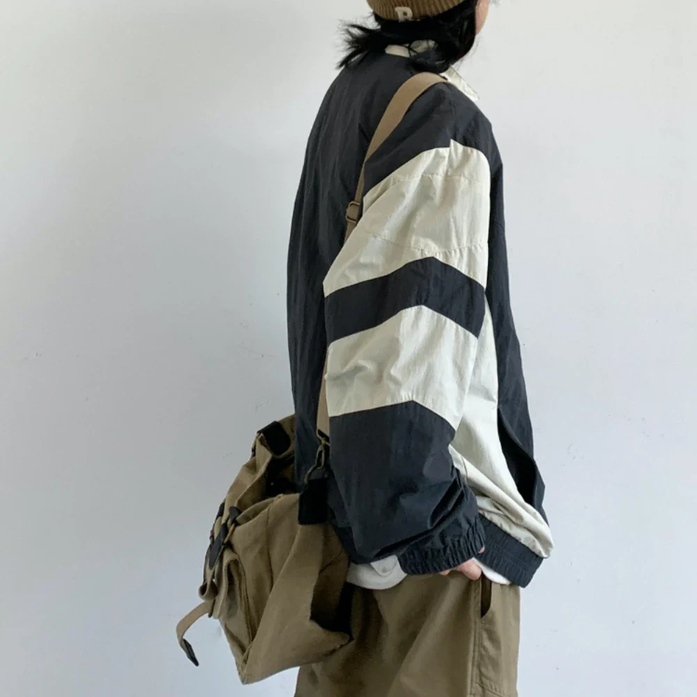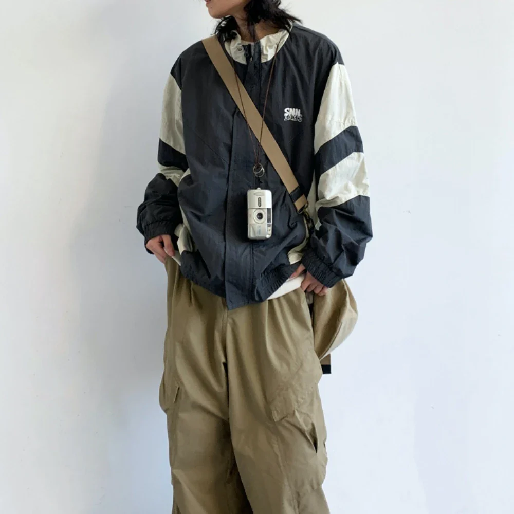 Cette veste coupe-vent s’inspire des créations techniques de Stone Island, où le color-blocking rencontre le streetwear japonais. Cette pièce distinctive, visible sur l’image en noir et blanc cassé, se démarque par ses empiècements contrastés et sa silhouette oversize.