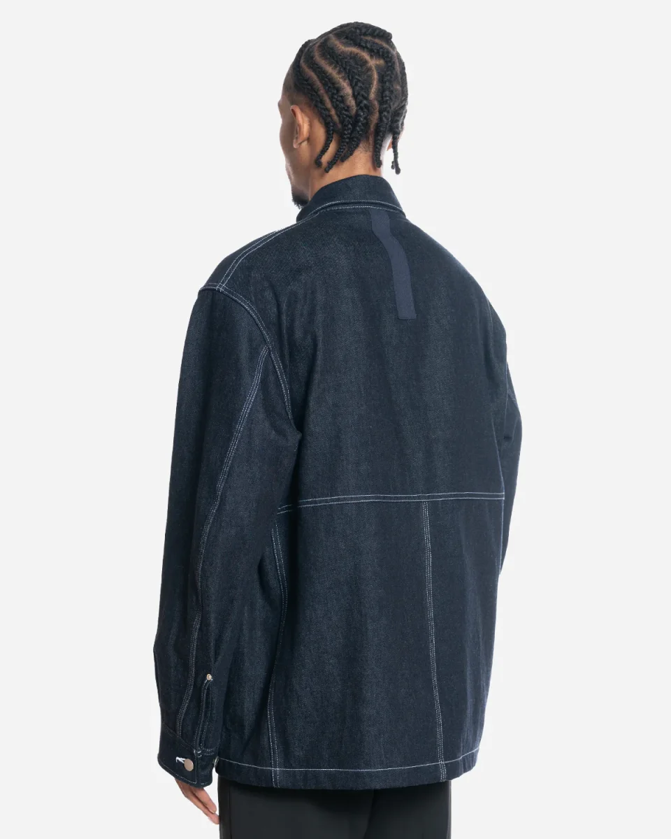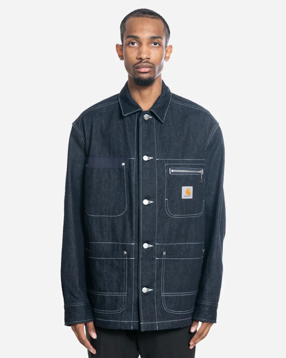 Confectionnée en denim indigo foncé, cette pièce résistante est rehaussée de surpiqûres contrastées blanches qui soulignent les différentes poches et panneaux. Une poche zippée sur la poitrine arbore le logo classique de Carhartt.