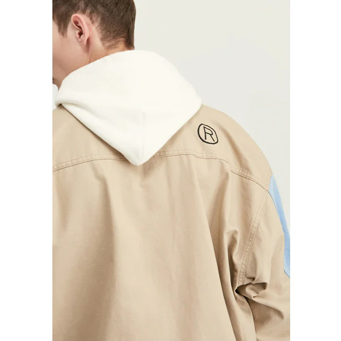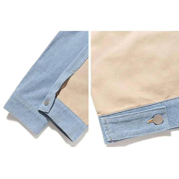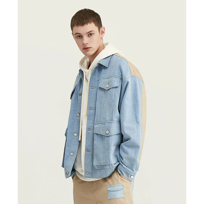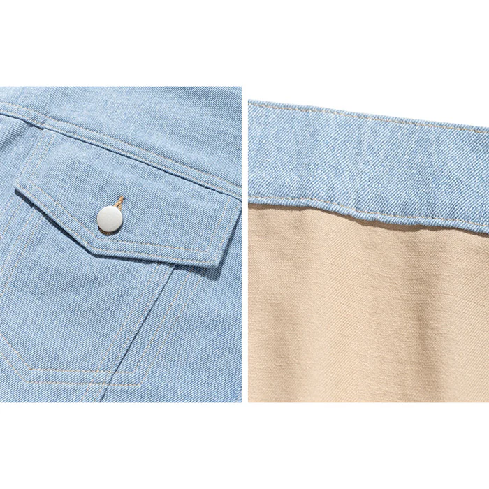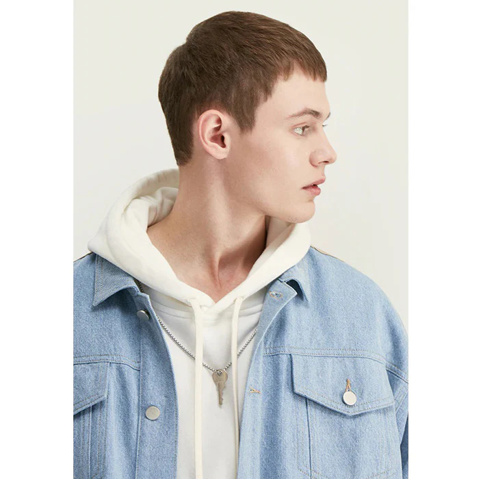 La première chose que l’on remarque sur cette veste, c’est le mariage de deux tissus de teintes différentes. Devant, un denim bleu pâle et derrière, une étoffe en jean beige. Le mélange de ces deux coloris donne beaucoup de caractère au vêtement, rappelant le style boys band de la fin des années 90. Si la coupe générale réunit les codes de la veste vintage, les deux grandes poches sur le devant ajoutent du style au vêtement.
