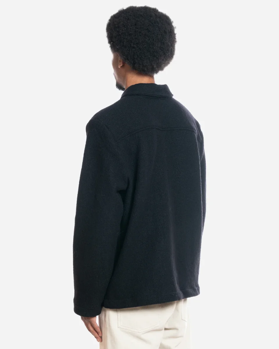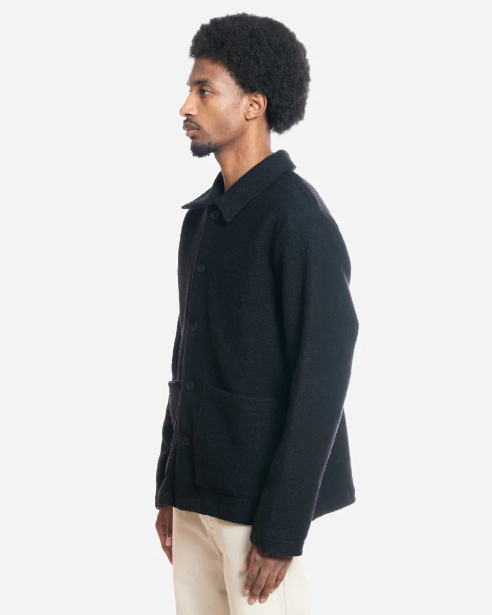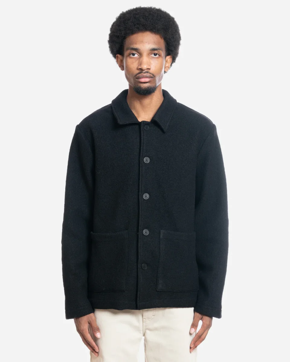 Veste en laine. Veste en laine à manches longues. Coupe droite. Fermeture boutons. Deux poches sur le devant. Composition : 100% Laine Nettoyage à sec uniquement. Référence : AW24-JKT-GRA-BAP-BLK Veste, laine, manches longues, boutons, poches.